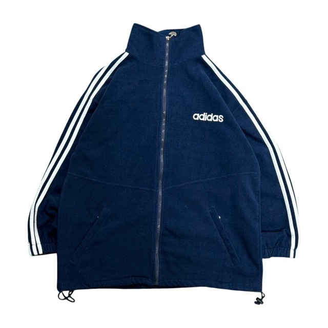 90年代 adidas のフリーストラックジャケット。トラックジャケットと聞くとタイトでスポーティーなイメージがありますが、この一枚はビンテージのアディダスによくある細身のシルエットとは違い、ゆったりとした今っぽいバランスで着られるのが魅力です。 深みのあるネイビーのボディは落ち着きがあり、大人っぽくも着られる万能カラー。さらに背面に大きく入るトレフォイルロゴが存在感を放ち、シンプルながらも確かな主張をしてくれます。フリース素材ならではの柔らかい着心地も相まって、スポーツウェアでありながらデイリーに馴染む一着です。 デニムやチノでカジュアルに、スラックスや革靴と合わせて都会的に、とスタイリングの幅は広大。シンプルな無地Tやフーディの上から羽織るだけでも、90sらしいストリート×スポーツのムードが自然と出せます。 アディダスのトラックジャケットは数あれど、フリース素材はなかなか見ません。90年代の空気感を纏いながらも現代的に落とし込める、通好みの一枚です。 [表記サイズ] L [実寸] 肩幅:59cm 袖丈:53cm 着丈:72cm 身幅:63cm ※多少のズレはご容赦ください。 [状態] C 左肩汚れ、首裏汚れ 参考 S...未使用品、デッドストック A...状態の良い美品 B...使用感はあるが、目立った傷や汚れなし C...目立つ傷や汚れあり D...難あり ※古着のため記載以外の細かな擦れや汚れがある場合があります。