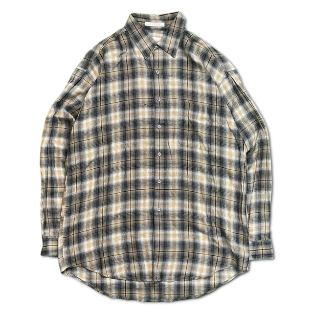 こちらは90年代ごろのペリーエリスのオンブレチェックシャツです。 コットン55%、レーヨン45%の混紡素材を使用しており、柔らかく軽やかな生地感が特徴で、非常に高級感があります。 袖は細めで、身体のラインにフィットするデザインなので、細身の方にはシックに着こなしていただけると思います。加えて、肩と背中にはタックが施されており、シルエットが非常に特徴的です。全体的にドッレシーな要素が強いですが、チェック柄が程よくカジュアルと上品さのバランスを保っており、カジュアルにもフォーマルにも対応できる一枚です。 [表記サイズ] L [実寸] 肩幅:56cm 袖丈:60cm 着丈:83cm 身幅:60cm ※多少のズレはご容赦ください。 [状態] C 右胸に小穴あります。 参考 S...未使用品、デッドストック A...状態の良い美品 B...使用感はあるが、目立った傷や汚れなし C...目立つ傷や汚れあり D...難あり ※古着のため記載以外の細かな擦れや汚れがある場合があります。