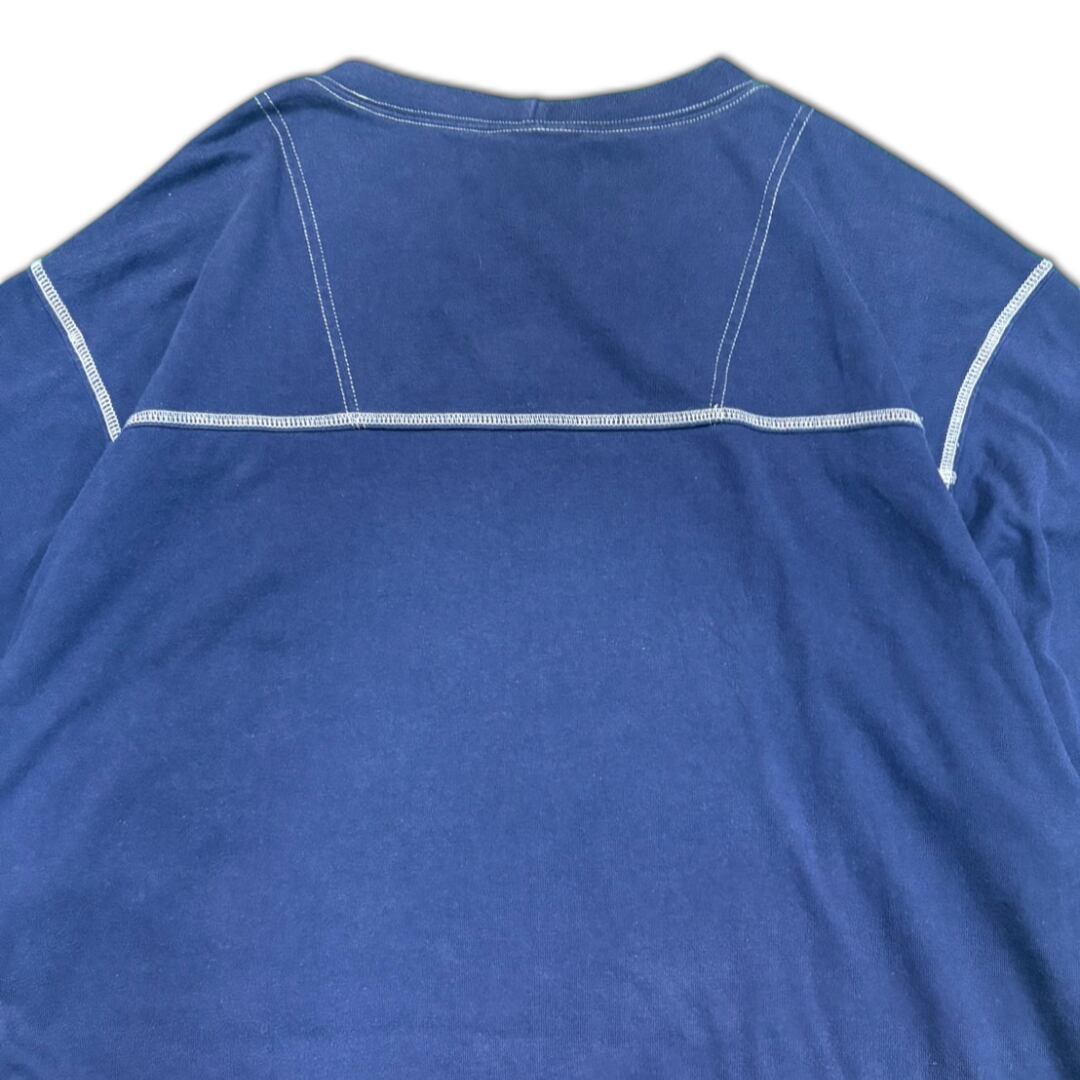 落ち着いたネイビーの色味に映えるホワイトのステッチが施されています。
