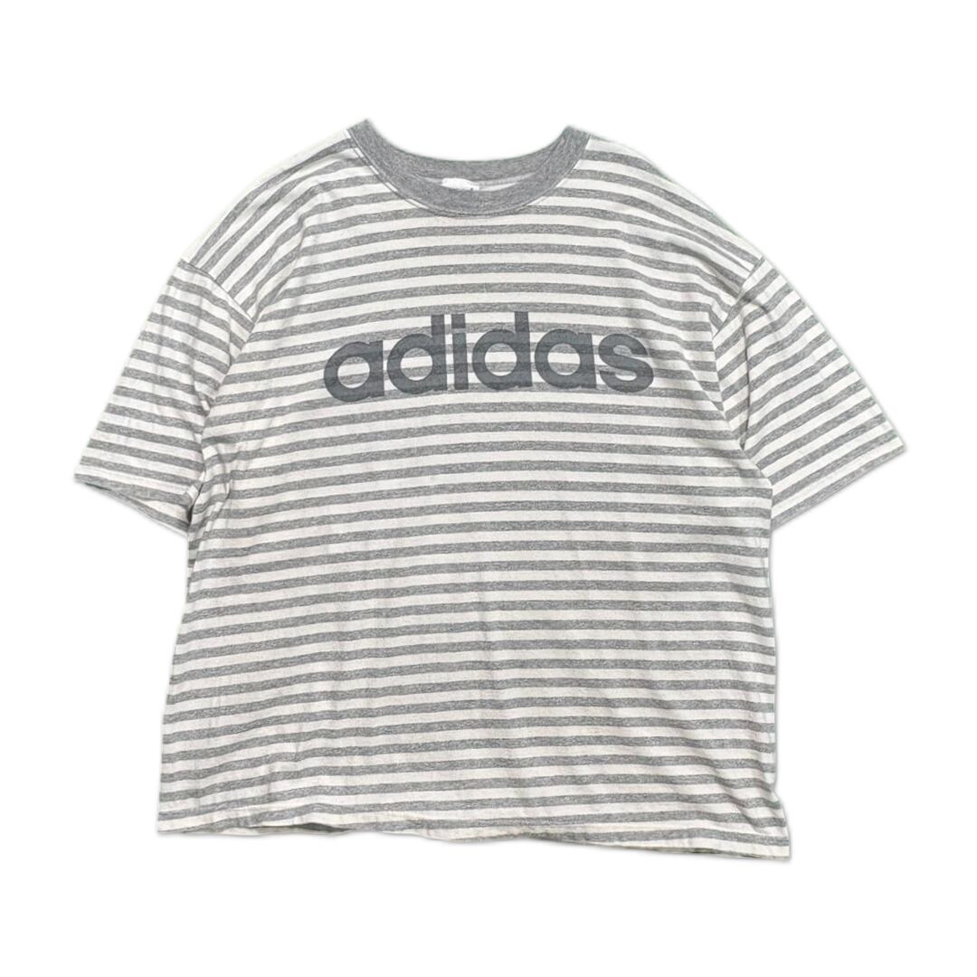 グレーベースの落ち着いたボーダー柄に、フロントへ大胆に配置されたブランドロゴが目を惹きます。スポーツブランドでありながら、どこかストリートライクな空気感があるのは、この時代のadidasならでは。