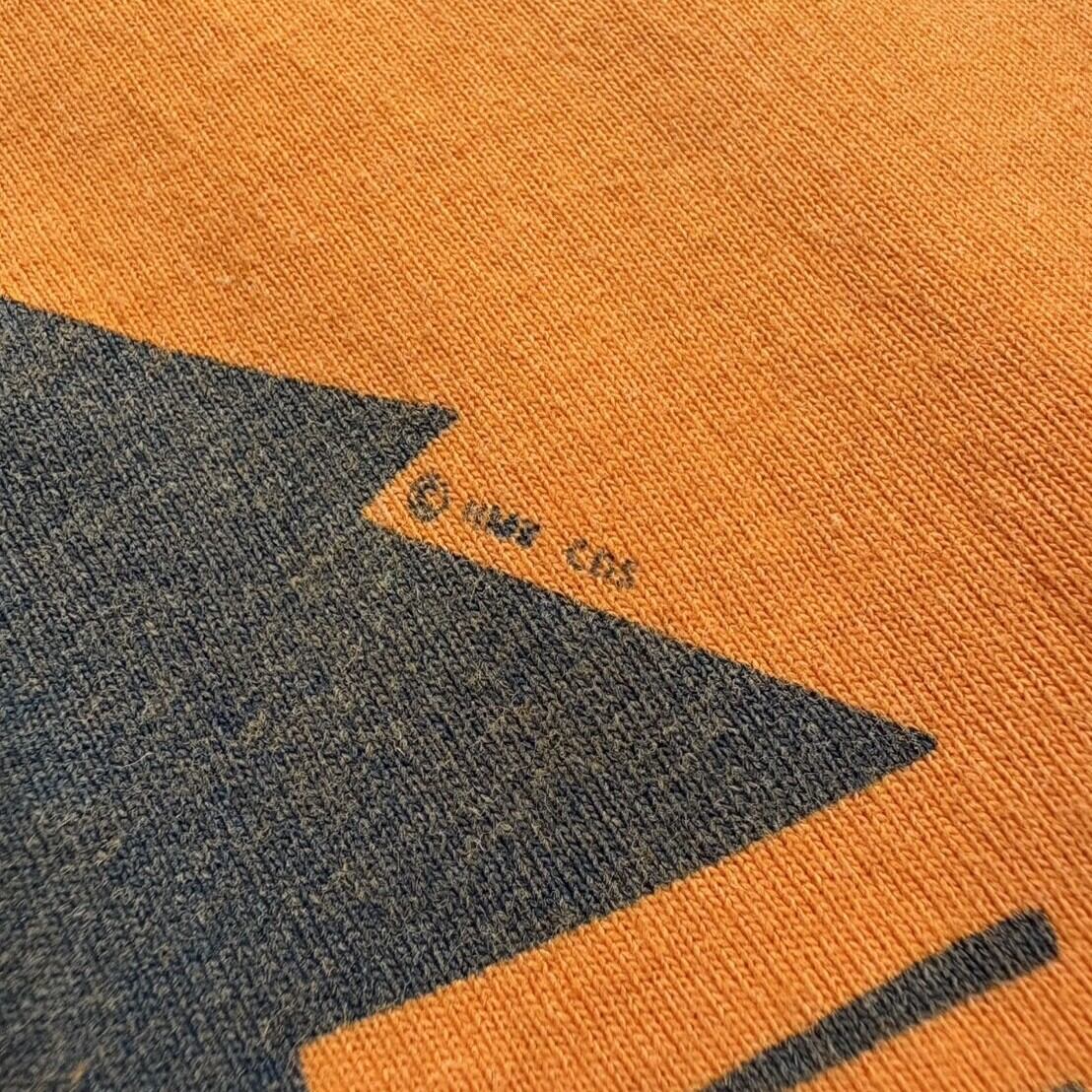 オレンジのボディに、目を見開きビリビリと毛を逆立てた黒猫のプリント。電流が走ったような衝撃とユーモアが共存する一枚です。Fruit of the Loomらしいくたびれた柔らかさ、着古された表情が古着好きにはたまりません。