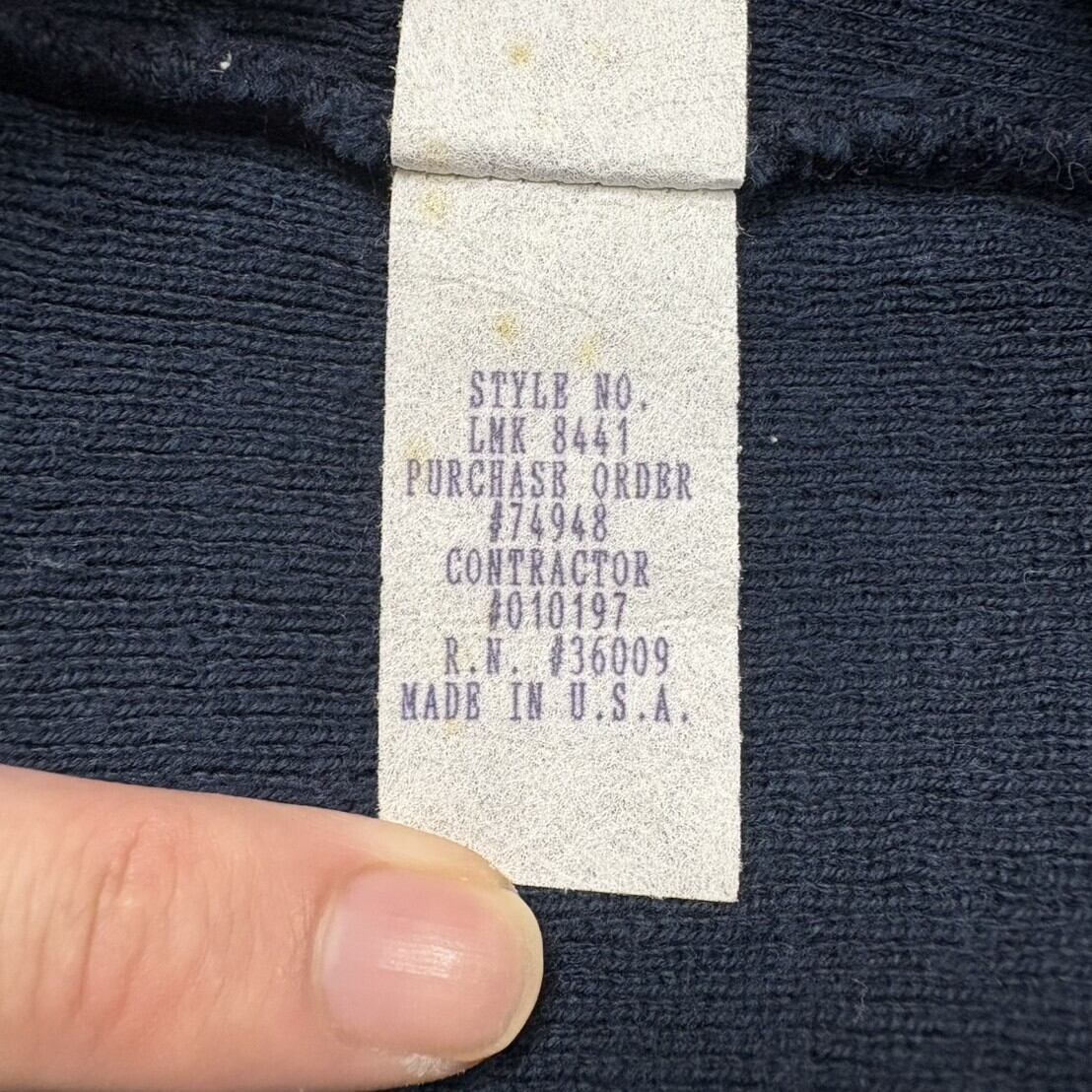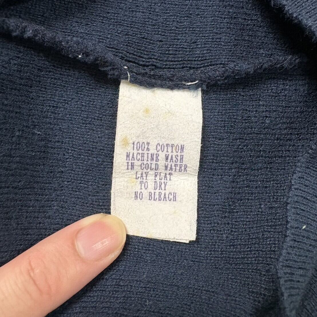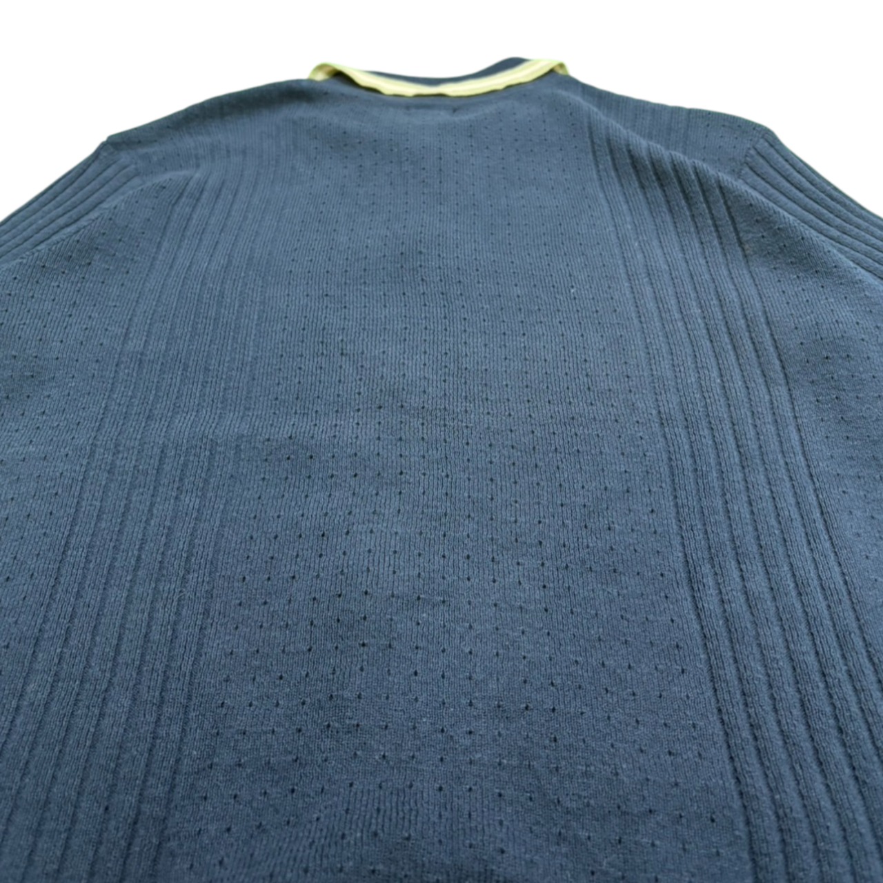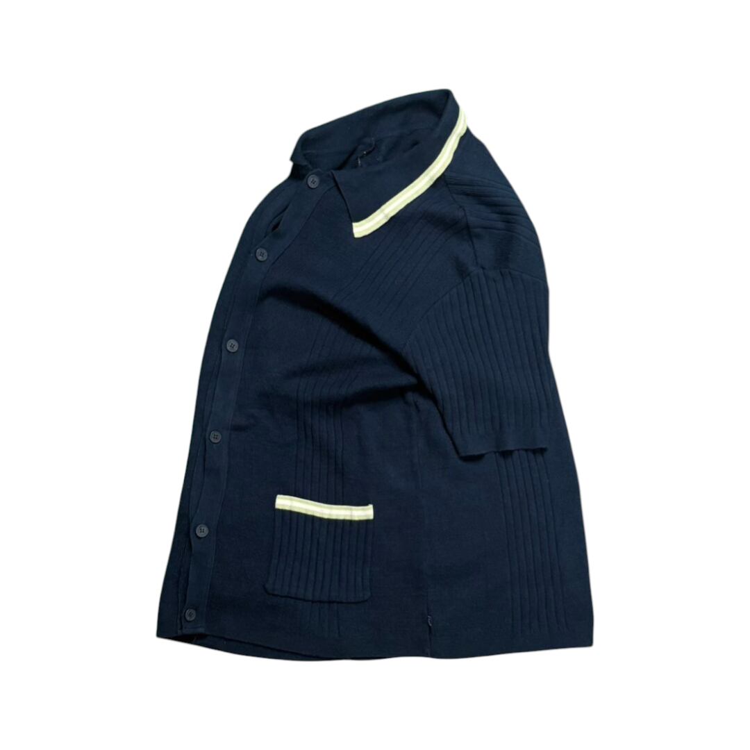 ポケット付き、襟付き、ボタンで開閉可能。カーディガンとポロシャツの中間のような、ちょっと不思議でお洒落な一着。ニット素材ならではの温かみと、ネイビーカラーの上品さが相まって、どこかレトロでシックな雰囲気を醸し出しています。