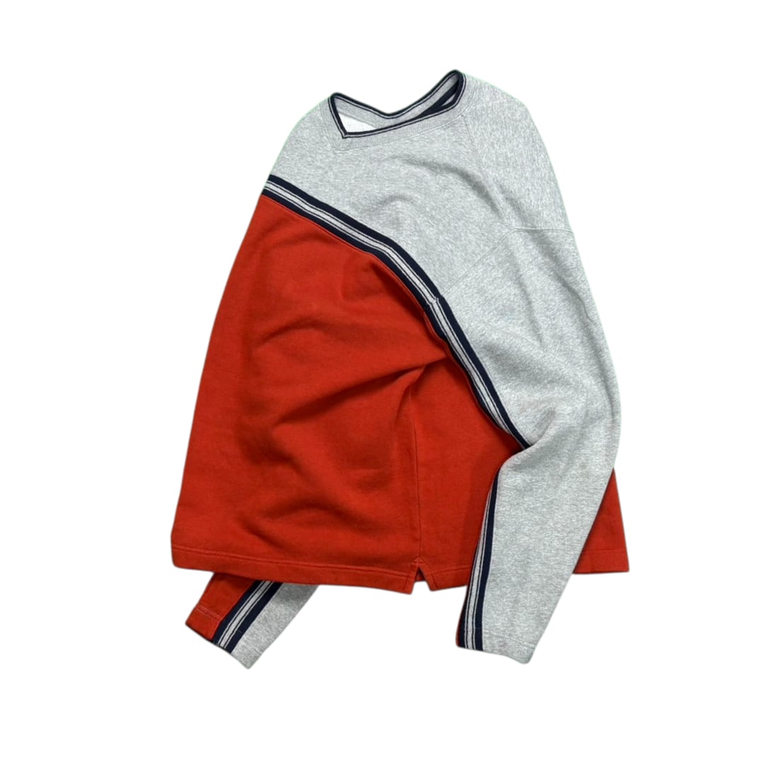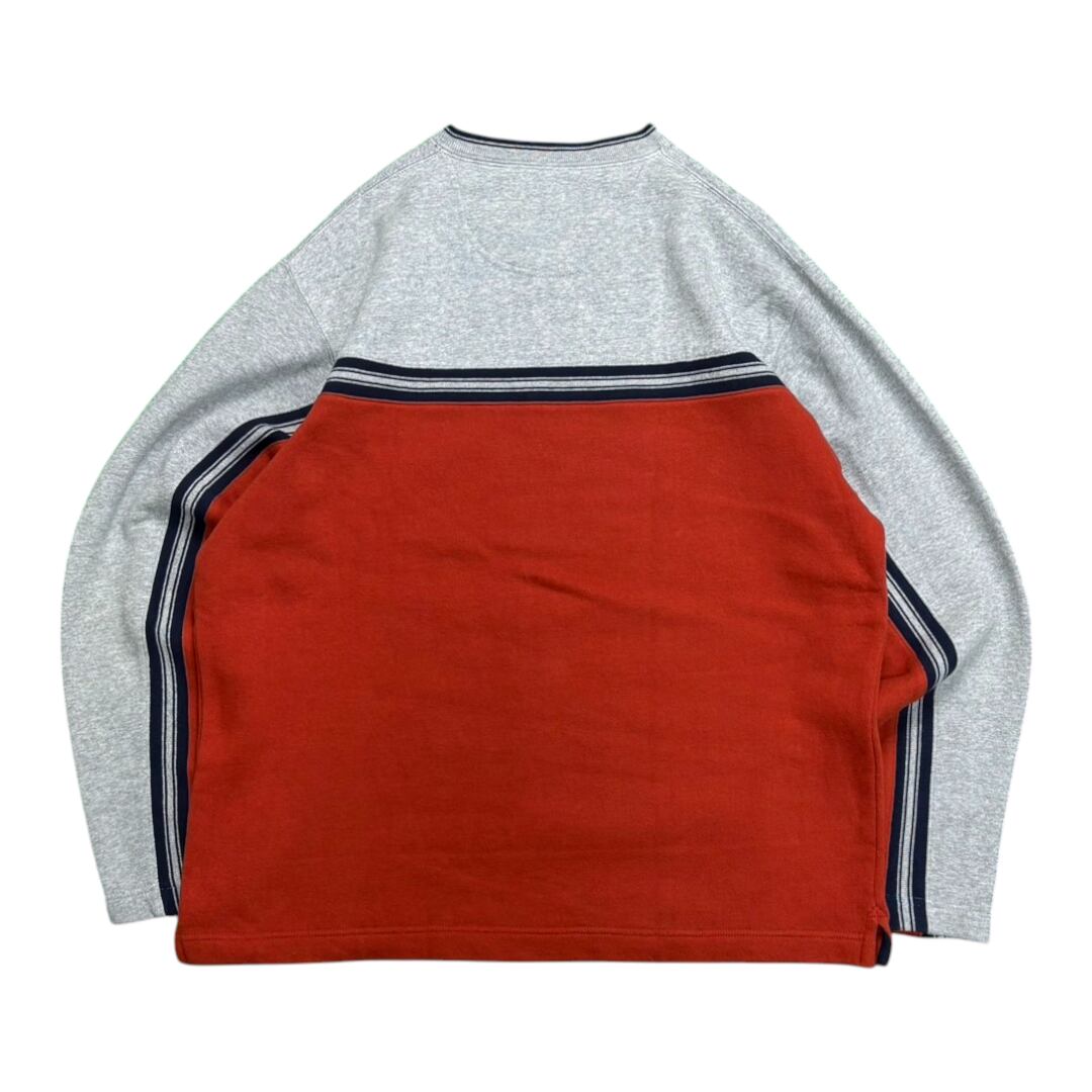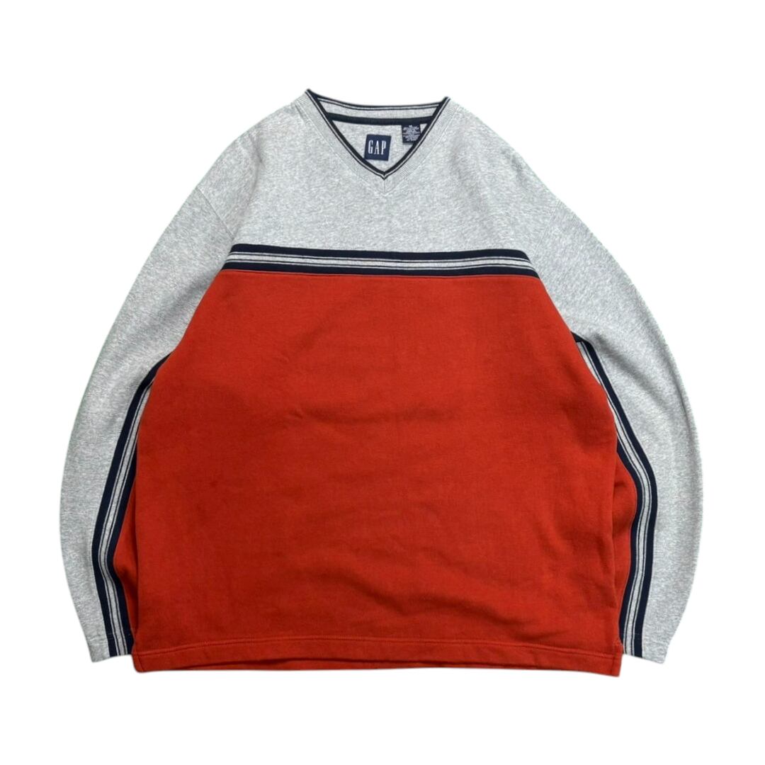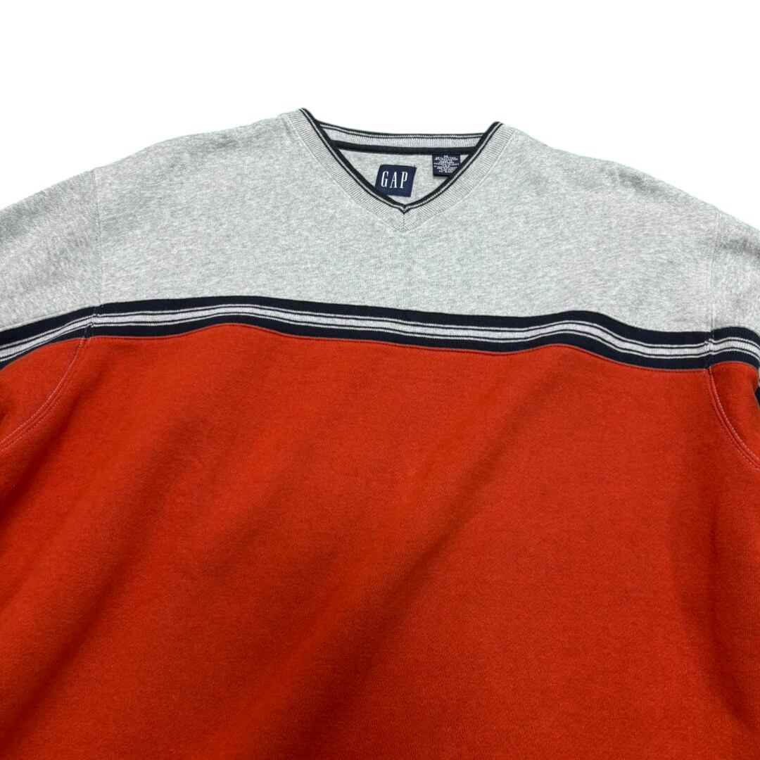 2000年代GAPのVネックスウェット。グレーとオレンジの切り替えが映え、胸から袖へと走るラインが特徴的な一着です。スポーティーながらもVネックのデザインが抜け感を与え、軽快で今っぽい雰囲気に仕上がります。