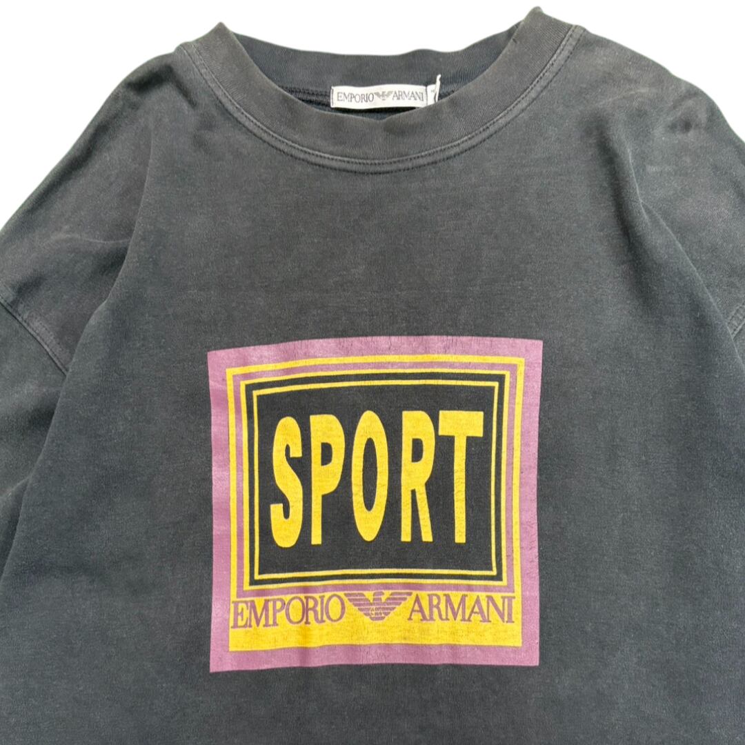 イタリア製のEMPORIO ARMANI、ブラックのロングスリーブTシャツ。フロントにはイエローとパープルの枠内に“SPORT”とポップに描かれた大胆なプリントが入り、モード感とストリート感を絶妙にミックスしています。シンプルながらも強い存在感を放つ、“かっこよすぎる”一枚。