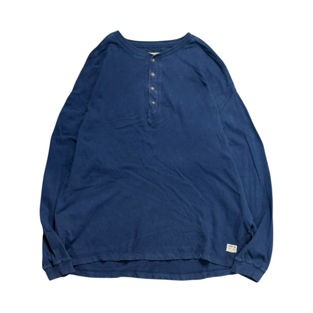 90年代のLevi’sによるヘンリーネックのロンT。深みのあるネイビーカラーが落ち着いた印象を与え、シンプルながら古着ならではのこなれ感を自然に演出してくれます。柔らかい生地感とヘンリーネック特有のデザインが、カジュアルスタイルに程よいアクセントを加え、普段着としても扱いやすい一枚です。