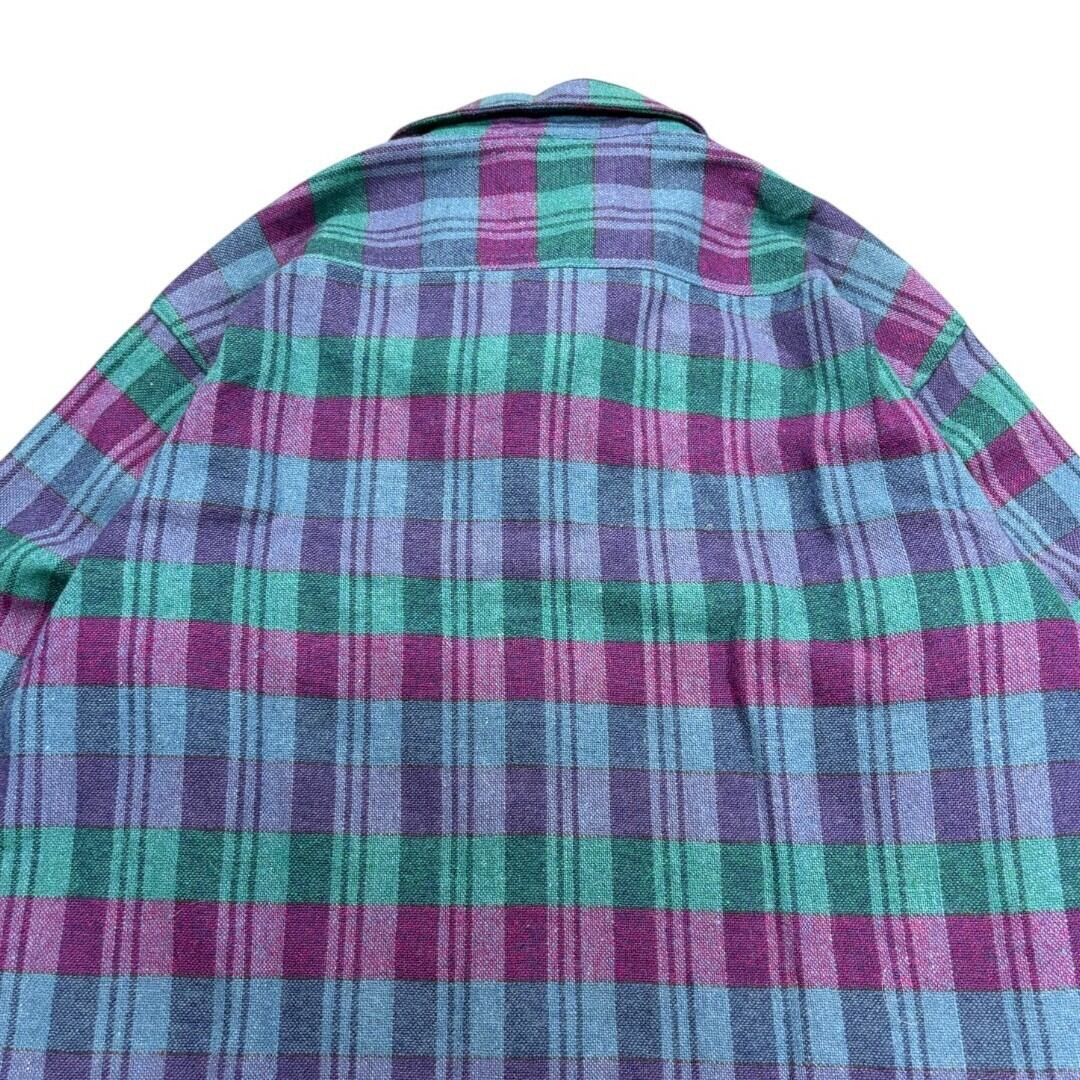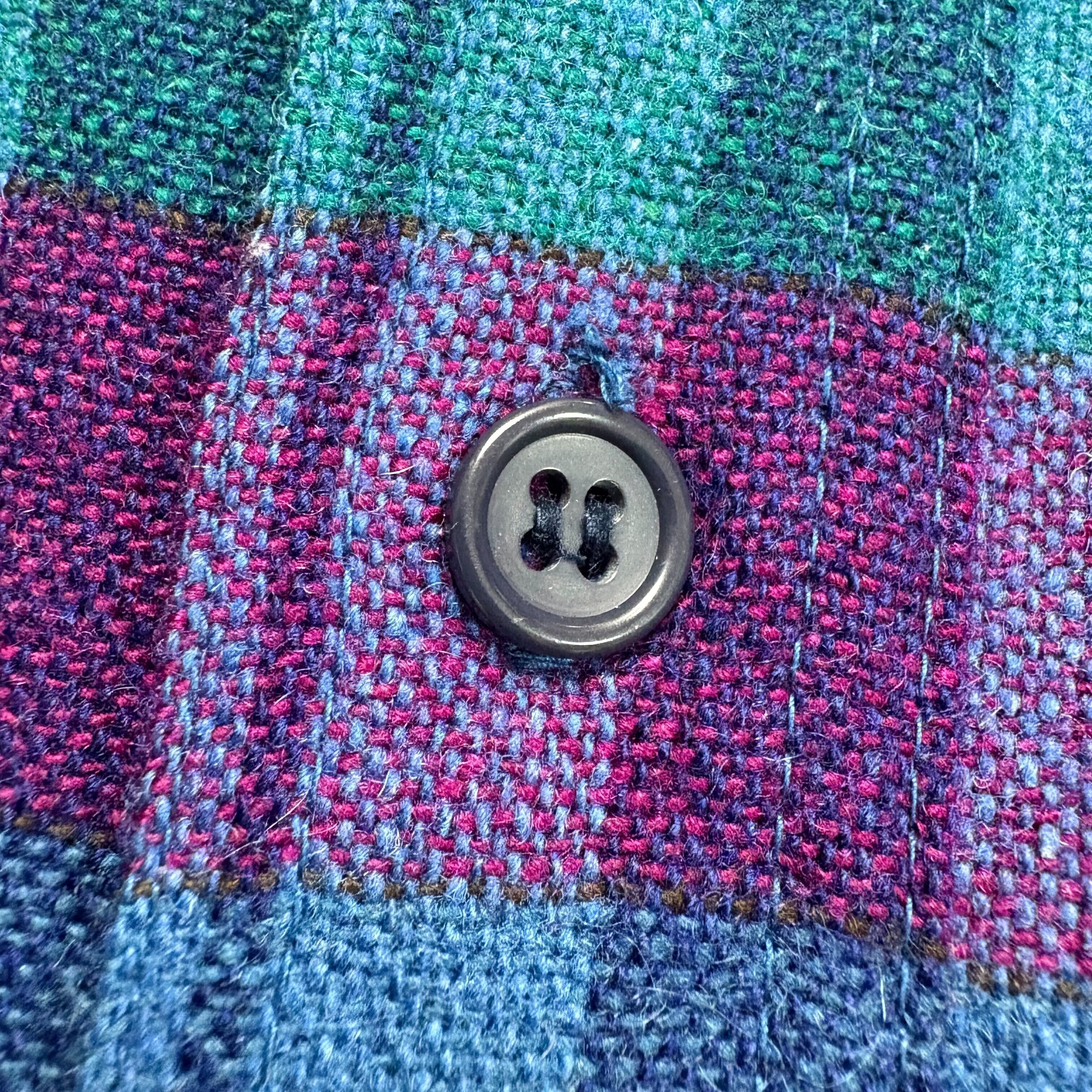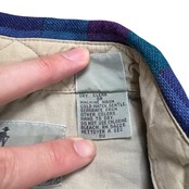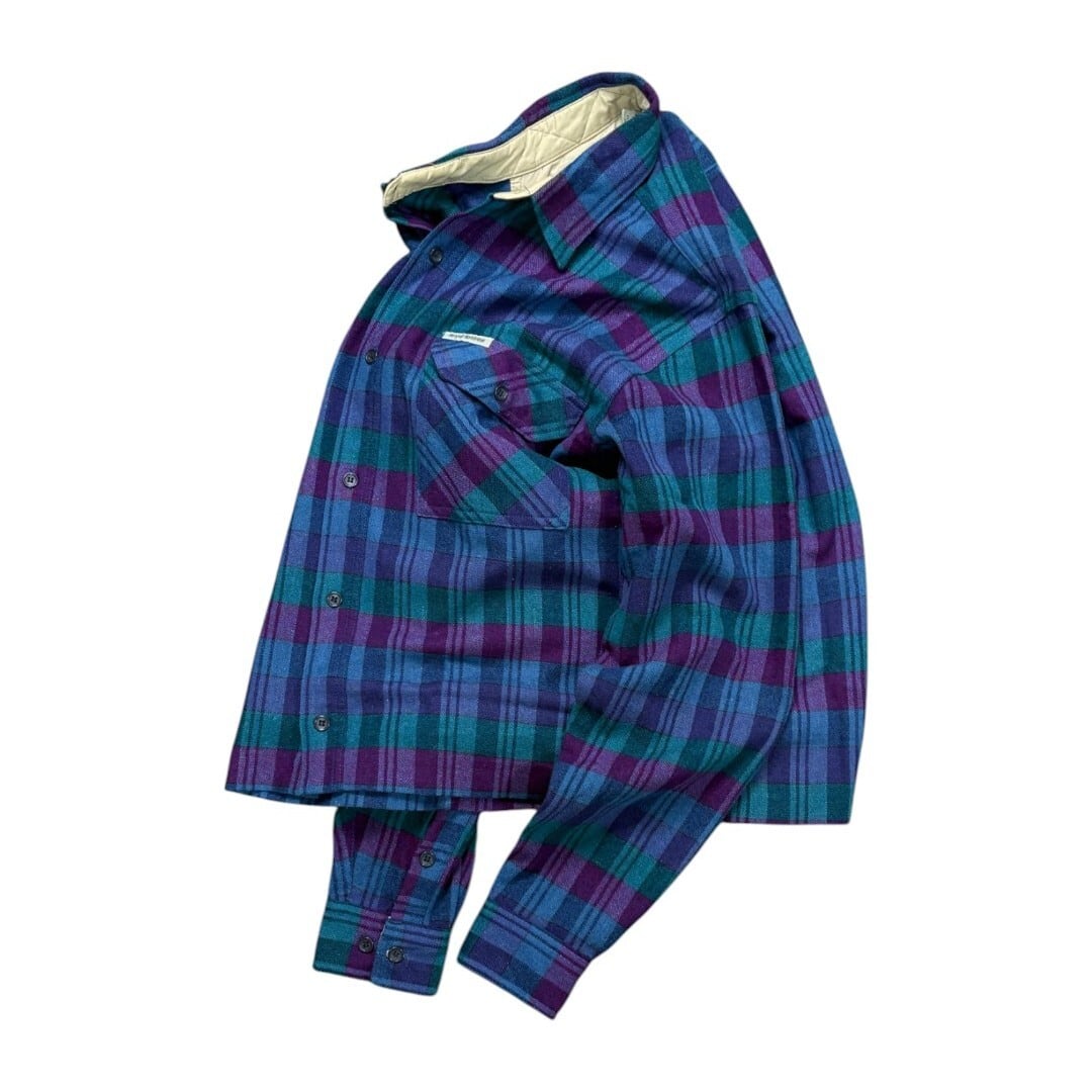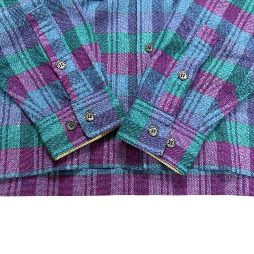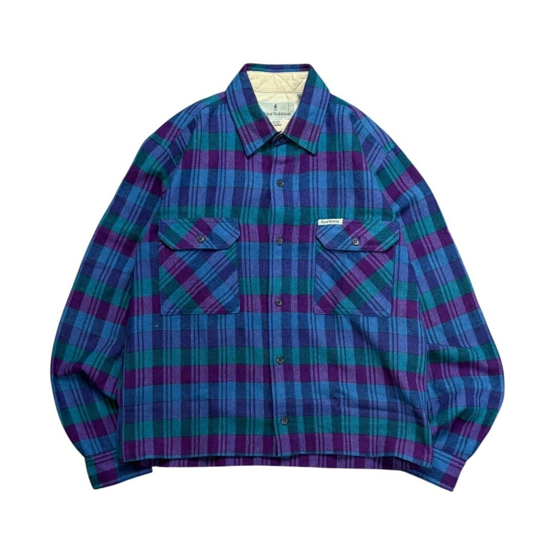 90年代頃のRoyal Robbinsから登場したボックスカットシャツ。青と紫を基調としたチェックパターンが特徴で、落ち着いたトーンながらもどこか都会的な洒落感を漂わせます。短めの着丈とワイドな身幅のバランスが独特で、シャツでありながらジャケットのように羽織れる存在感のあるシルエット。