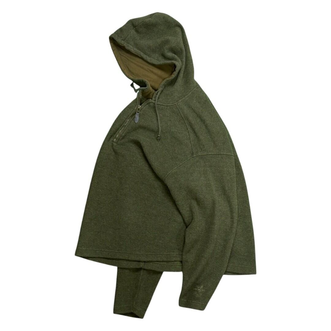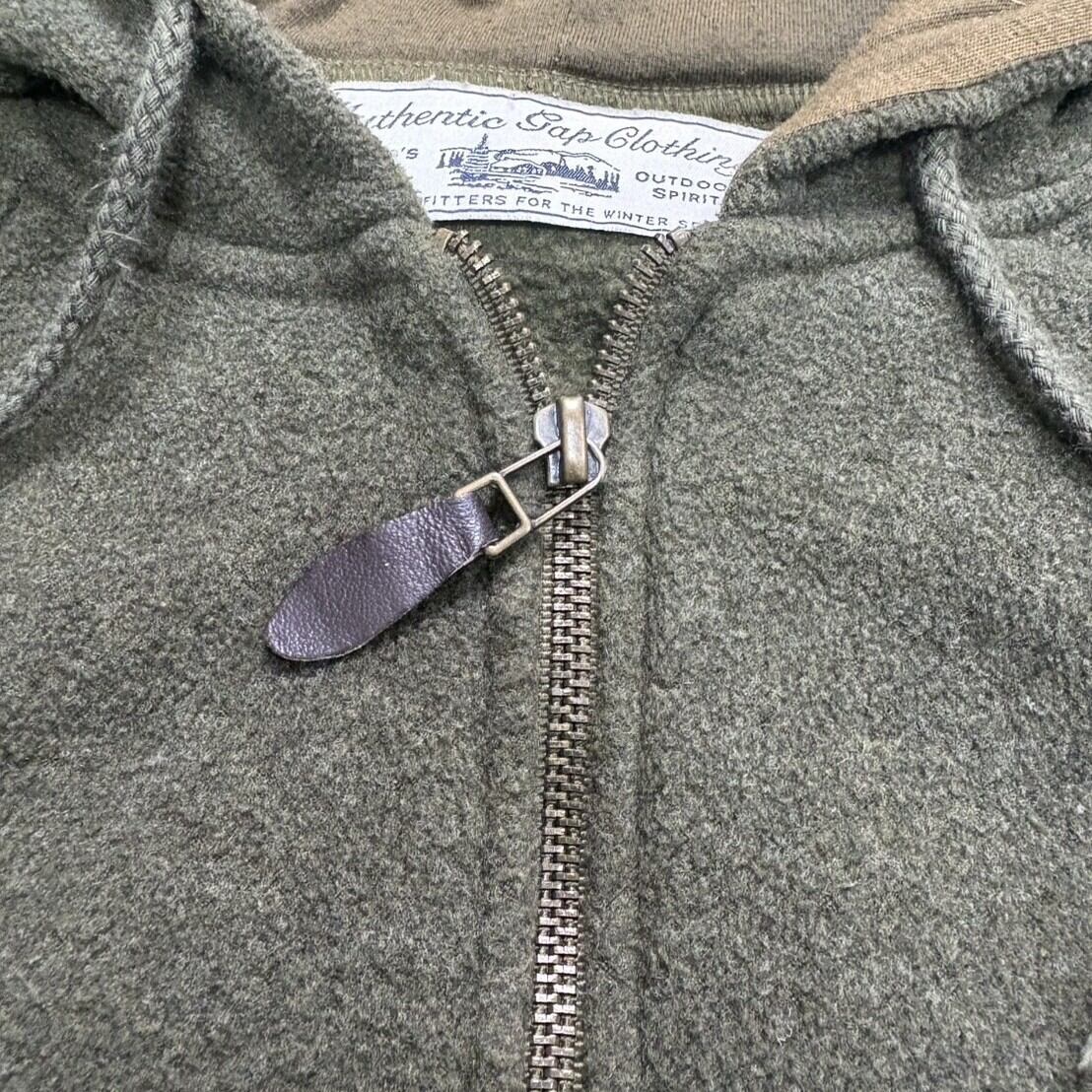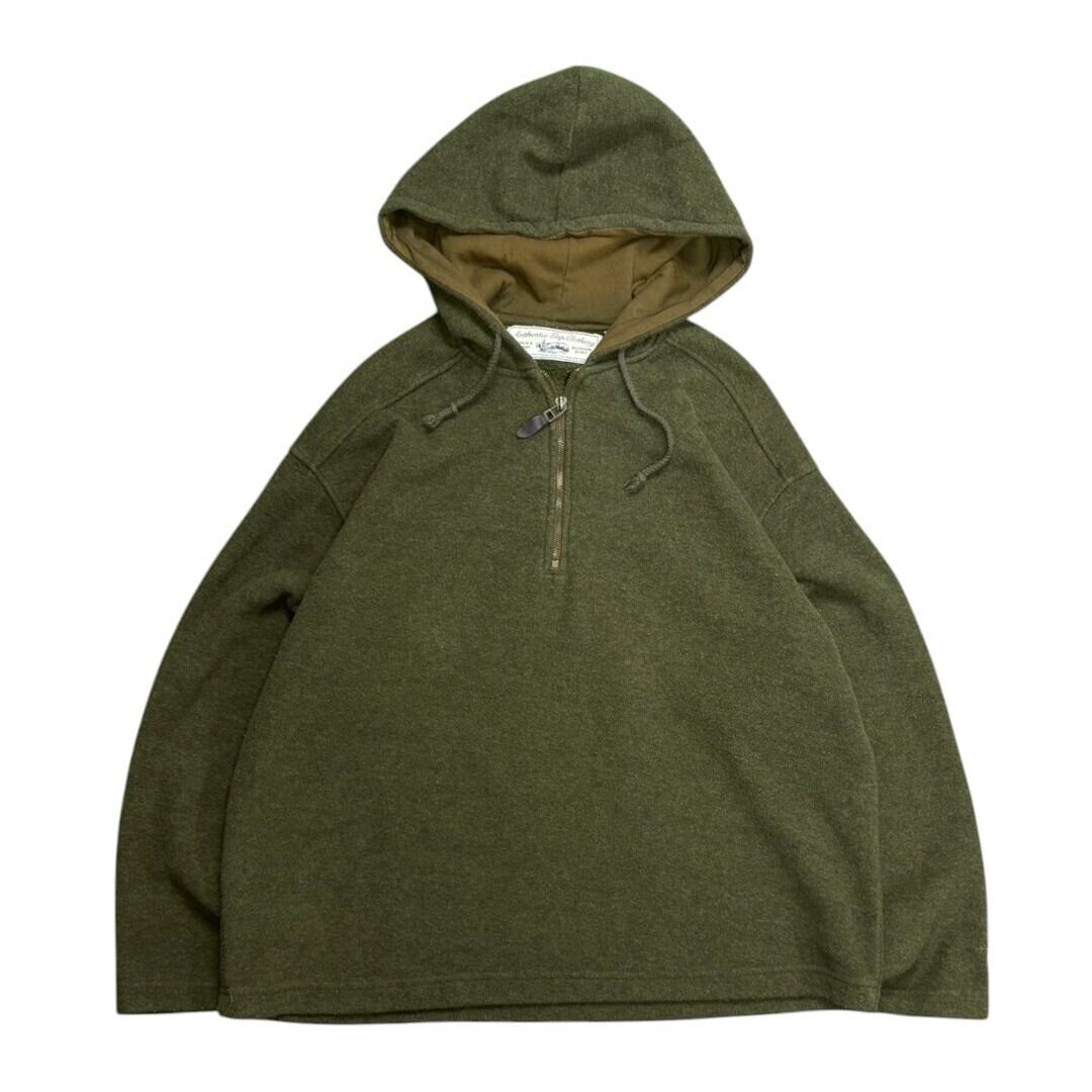 90s OLD GAP のハーフジップフリースフーディ。カーキがかった落ち着いた色味で、古着らしい柔らかさと抜け感を併せ持った一枚です。サイズ感はジャスト目で、身幅のバランスも現代のスタイリングにぴったり。