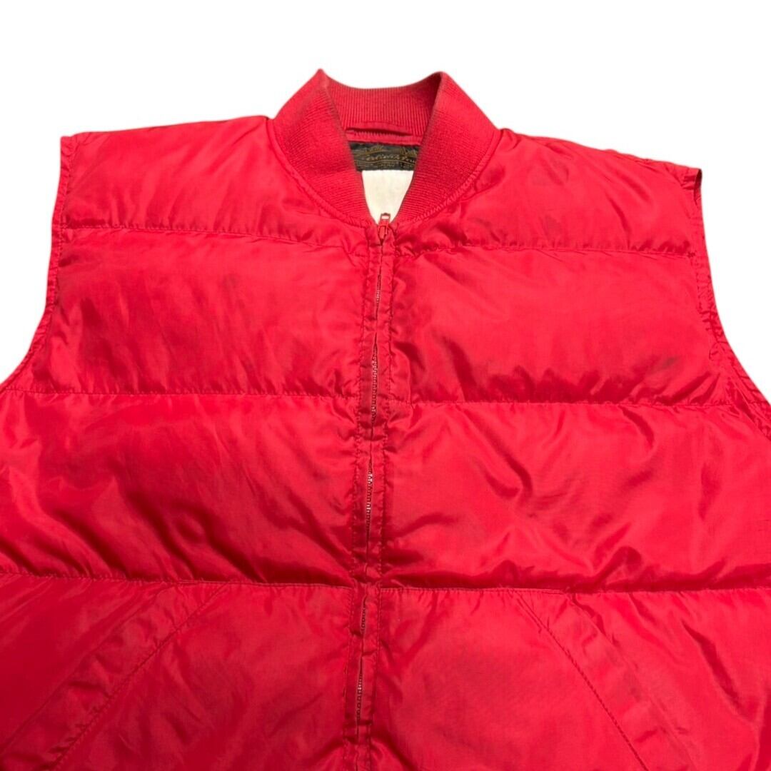 鮮やかな赤の発色が目を引く、70〜80年代 Eddie Bauer のグースダウンベスト。当時からアウトドアブランドとして確かな信頼を得ていたエディーバウアーらしい、質実剛健なつくりと発色の美しさが際立つ一枚です。ダウンのボリュームはしっかりとありながら、シルエットはすっきりとしていて野暮ったさがなく、タウンユースにもすんなり馴染みます。
