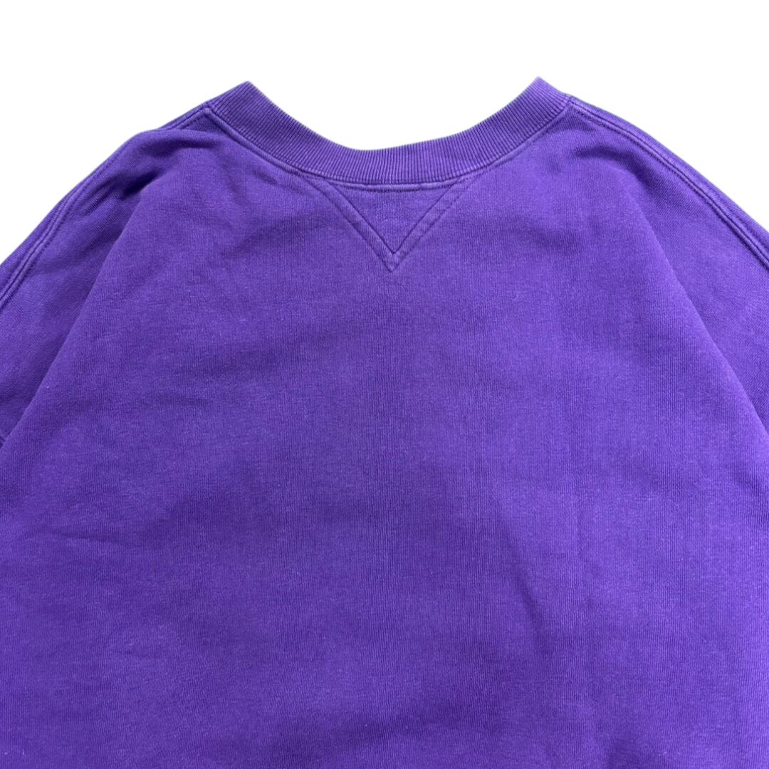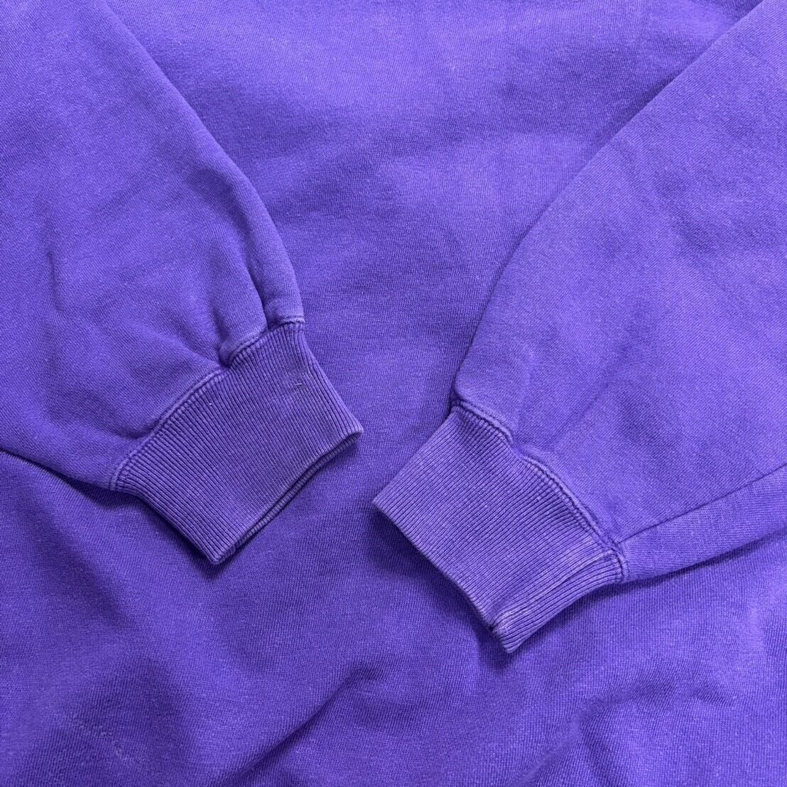 前Vガゼット(襟元の三角補強)付きで、クラシックな古着スウェットらしいディテールが光る一枚です。淡く褪せたパープルカラーは、派手すぎず程よい存在感。古着ならではの柔らかく着やすい質感も魅力です。