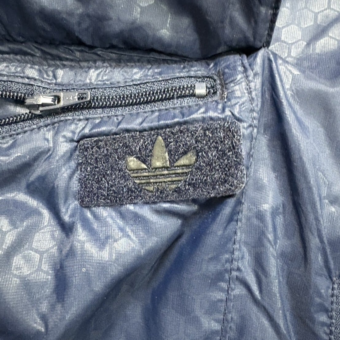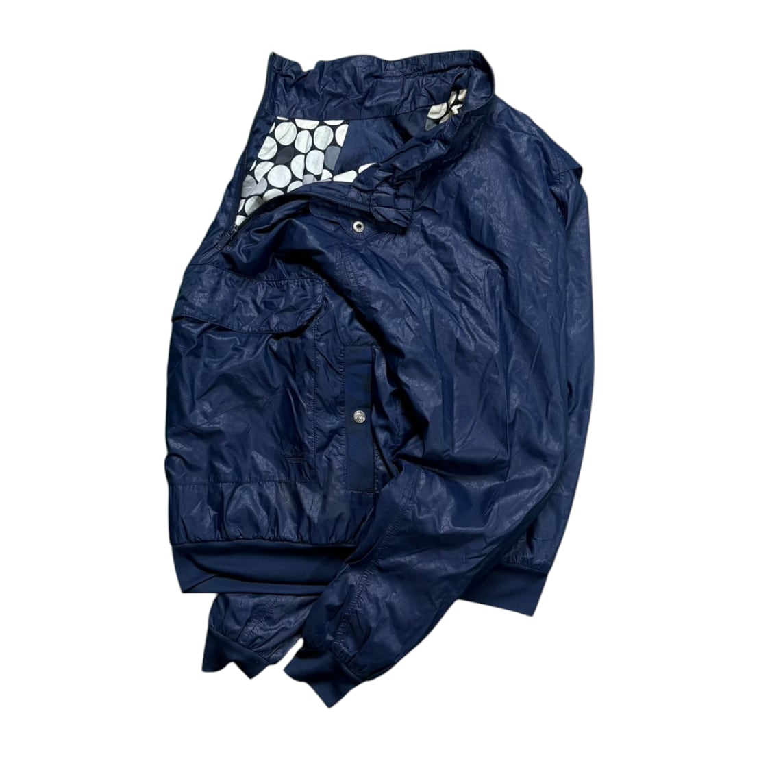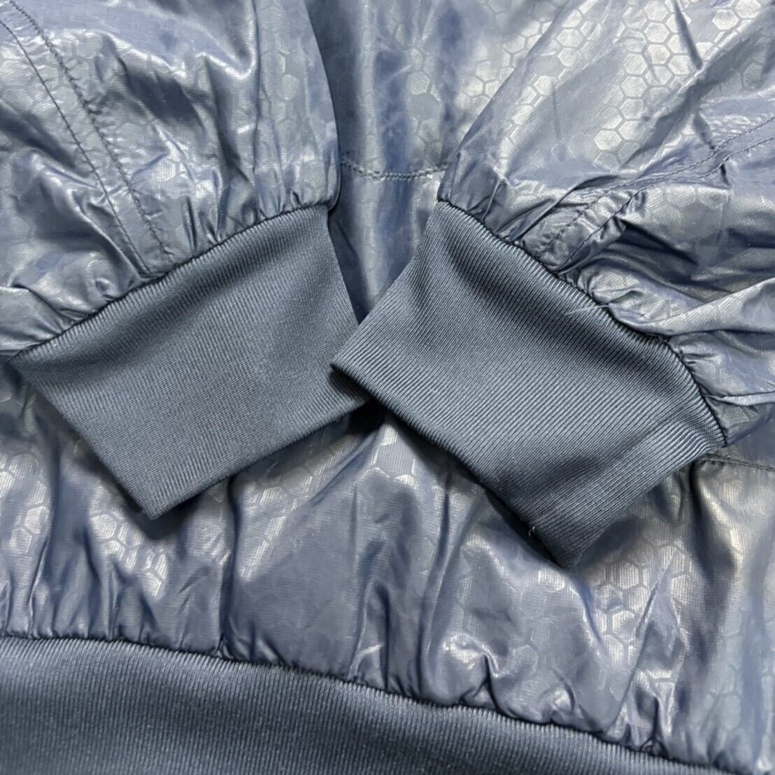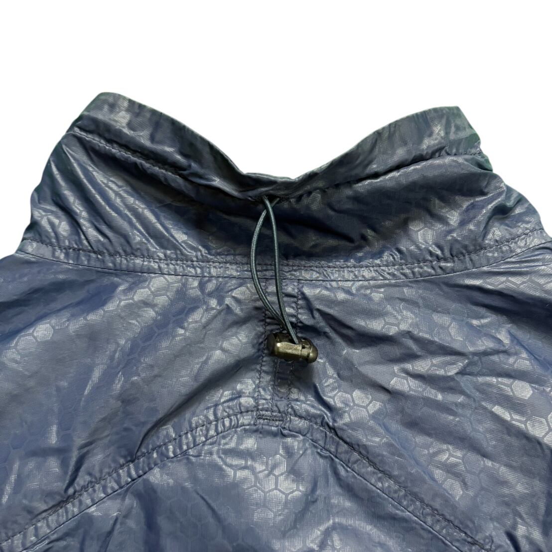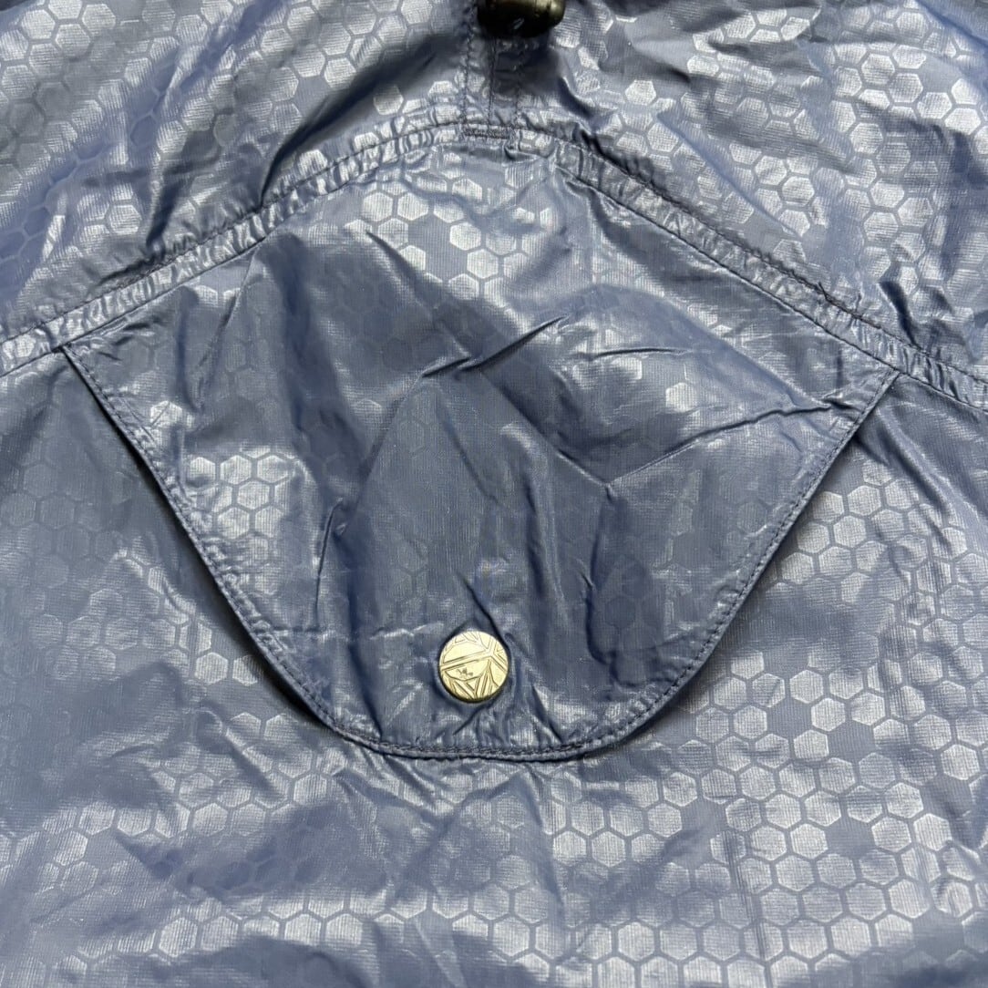 暗めのネイビーに包まれたボディが渋く、どこか都会的な空気を漂わせるナイロンプルオーバー。襟元にはドローコード、大きめのフロントポケット、そしてハーフジップ仕様。機能的なディテールを惜しみなく詰め込みながらも、全体はすっきりとまとまり、うるささを感じさせないのがさすがのデザインバランス。よく見ると生地表面には無数の六角形模様が浮かび上がります。スポーティでありながら上品、日常にもアウトドアにも馴染む完成度の高い一着。