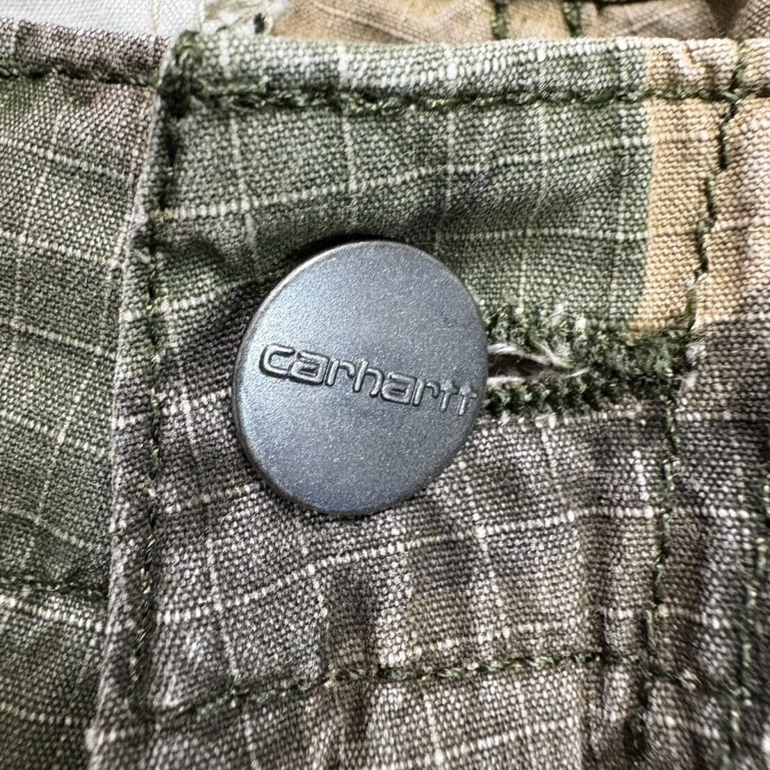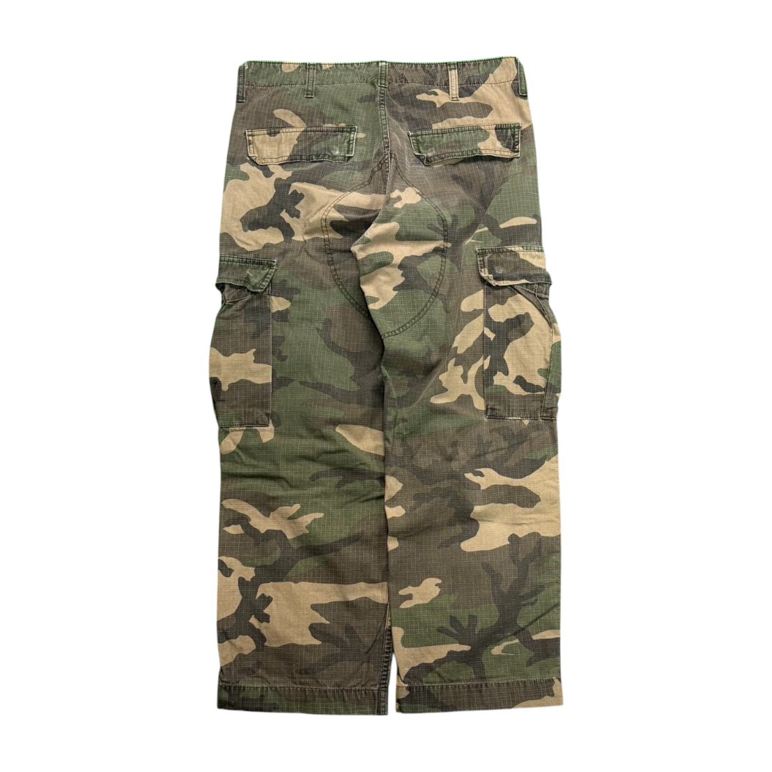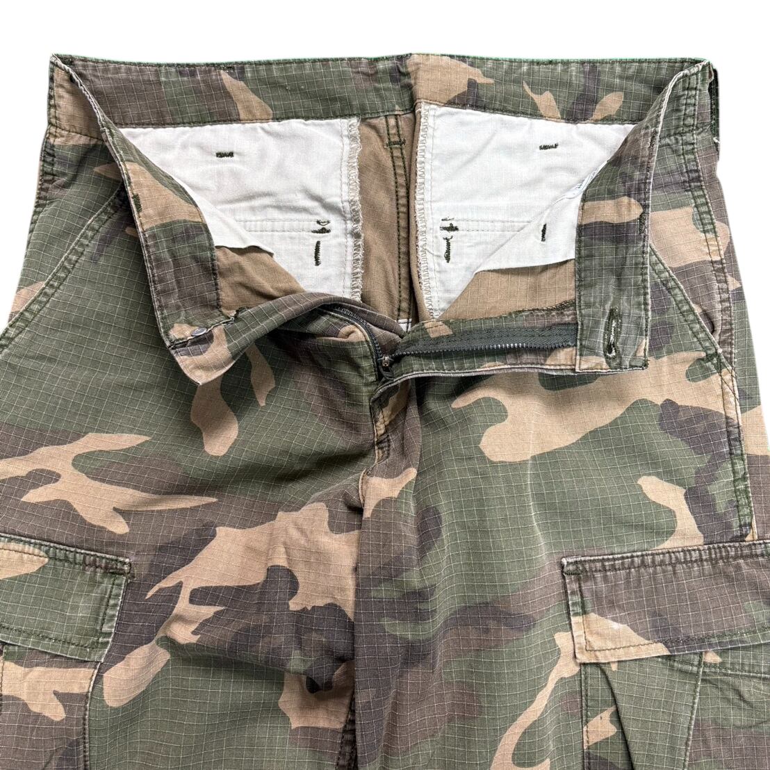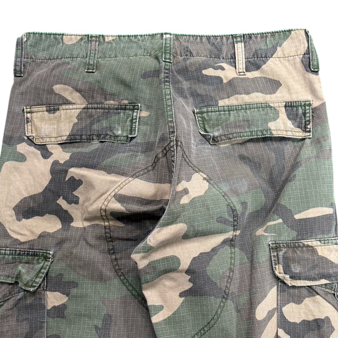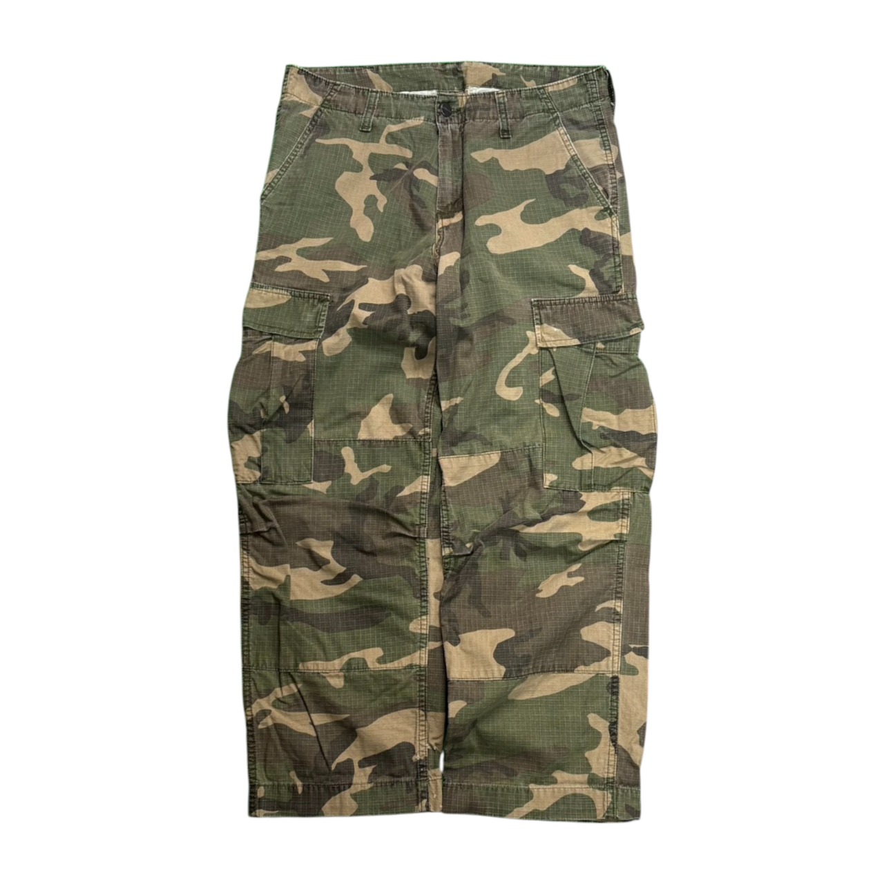 ワークウェアの代名詞Carharttから、リップストップ生地を使用したダブルニー仕様のカモ柄カーゴパンツ。耐久性と実用性を極めた一本で、現行ラインとは一線を画す無骨な存在感があります。