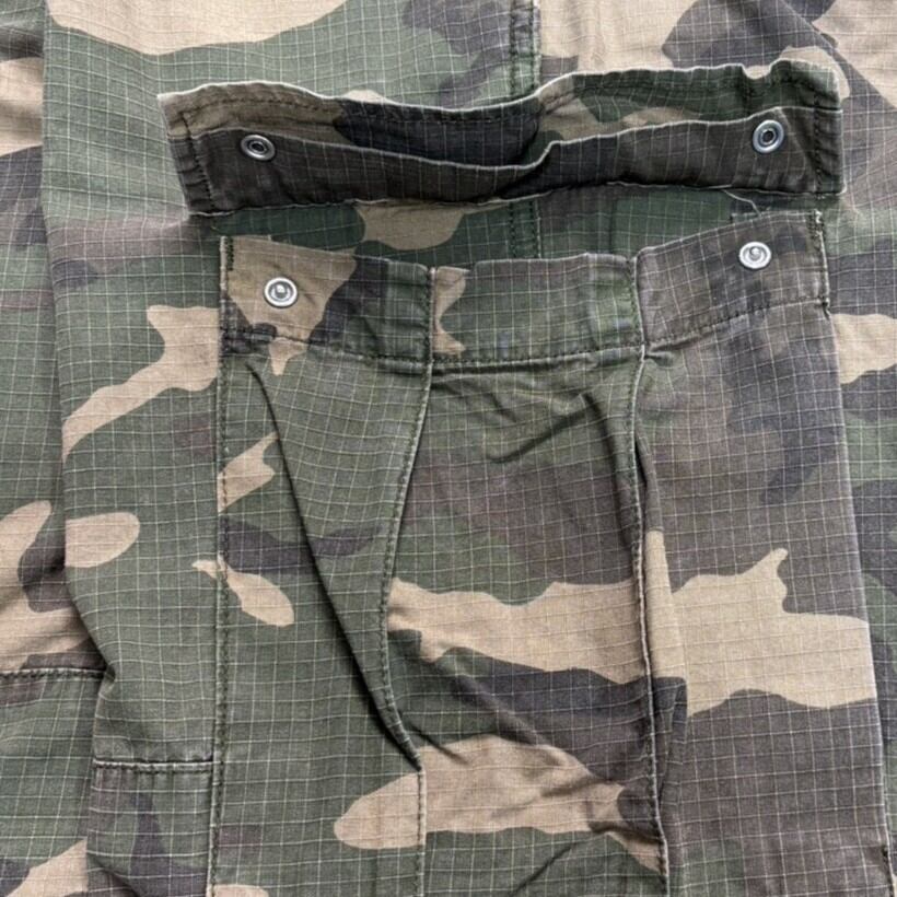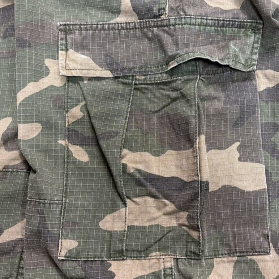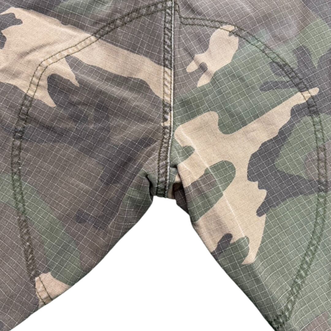 ミリタリーの要素を感じさせるカモに、ワークパンツ特有のダブルニー構造が組み合わさったデザイン。無骨で土臭いのに、どこかストリートっぽくもある絶妙なバランスです。リップストップ生地は軽くて丈夫、膝の補強もあるためハードな着用にも対応。