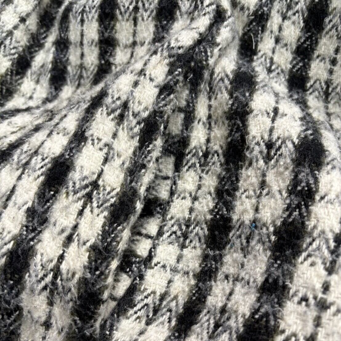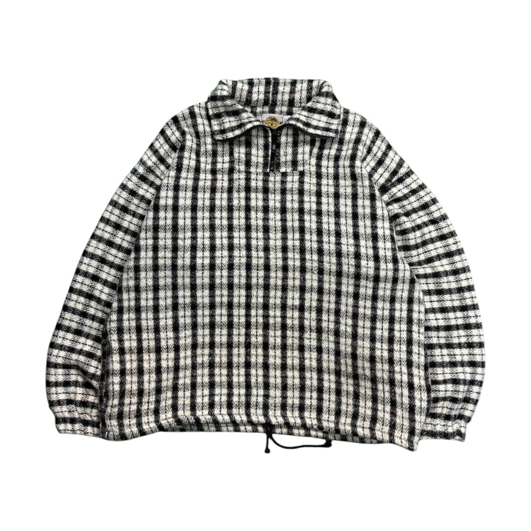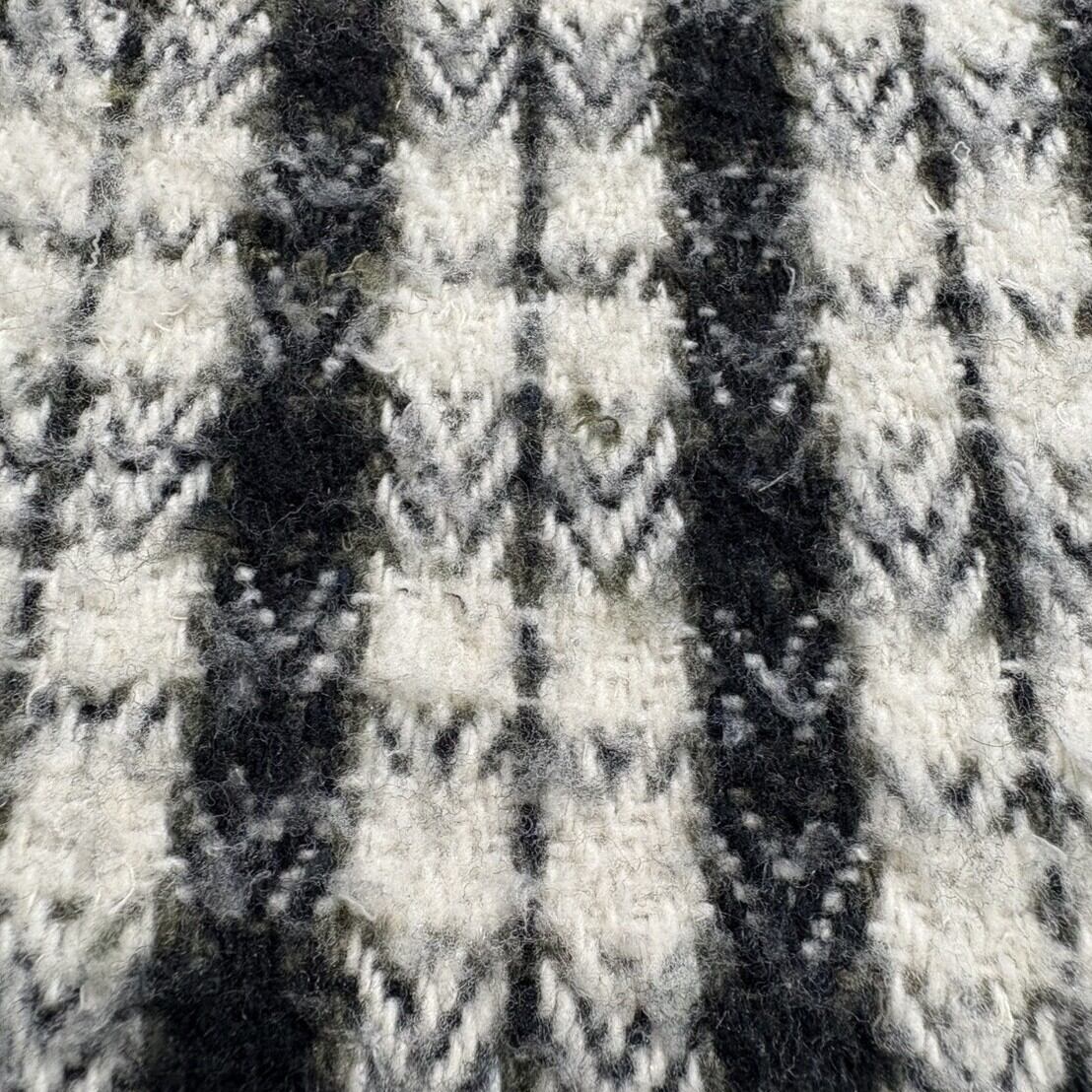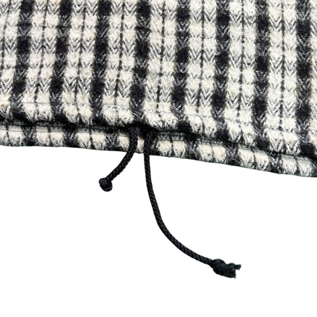 このアイテムはポリエステル・コットン・アクリル混紡の、毛羽立ちが柔らかく温かみのある素材感が特徴。モノトーンの落ち着いたチェック柄は派手さを抑えつつ、着るだけで雰囲気が出る完成度の高いデザイン。
