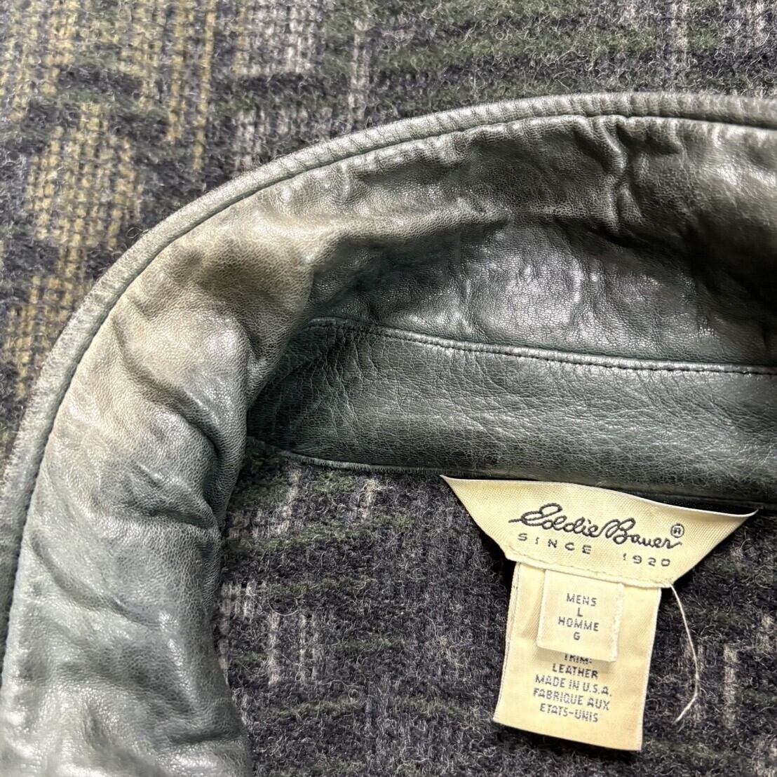 90年代Eddie Bauerのブランケットウールジャケット。ネイティブ柄を思わせる独特のパターン、とはいえ配色は落ち着いていて、派手になりすぎず渋く着られる絶妙な仕上がりです。襟にはレザーが施されており、ブランケットウールとの異素材コンビが存在感をさらに引き立てます。こういうディテールの入れ方が、まさに90s Eddie Bauerのセンスそのもの。