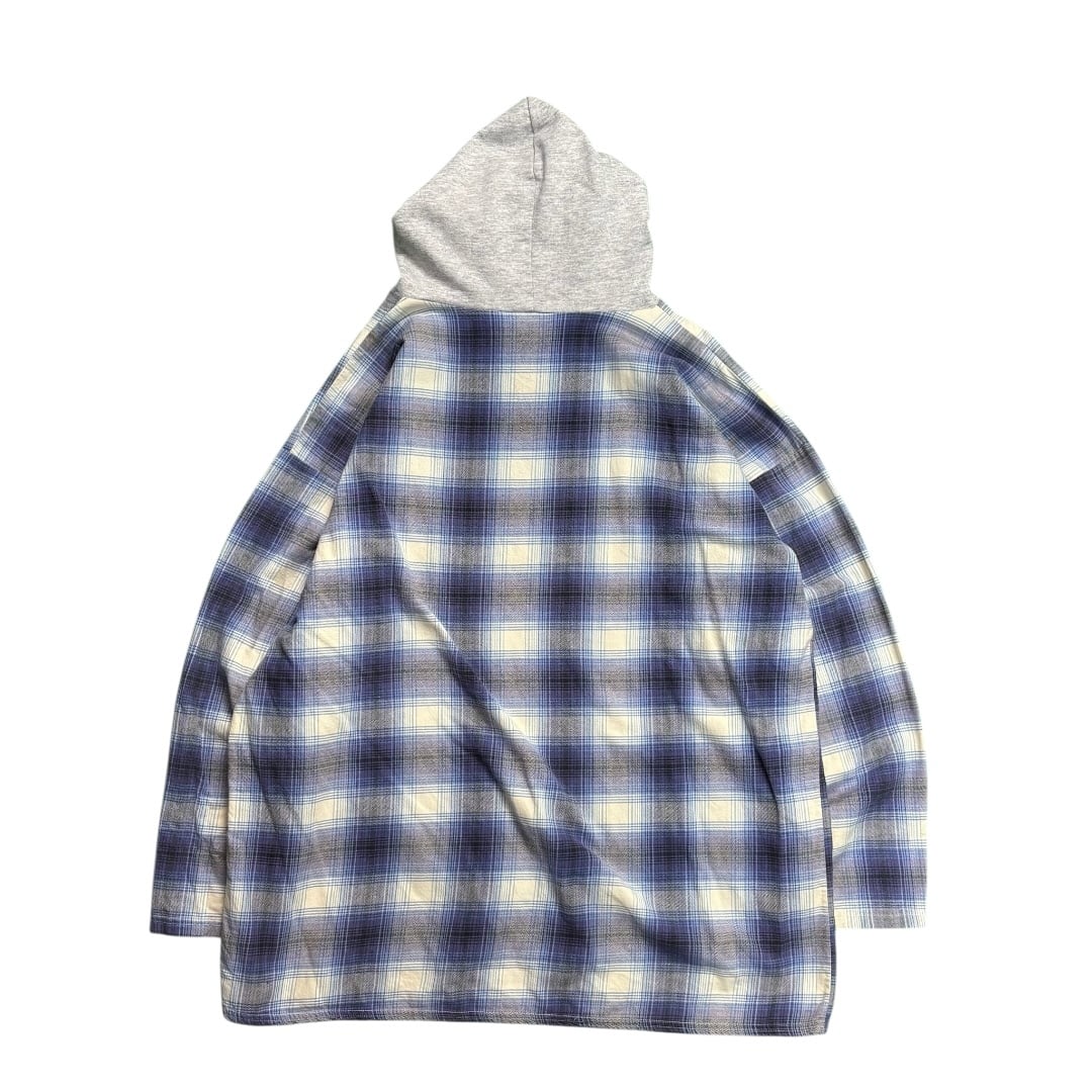 オンブレチェックのシャツ生地を使った珍しいプルオーバーフーディー。ぱっと見はオンブレのチェックシャツなんだけど、実はフード付きのパーカーという意外性があって、レギュラー古着でもしっかりキャラクターを持っている一枚。