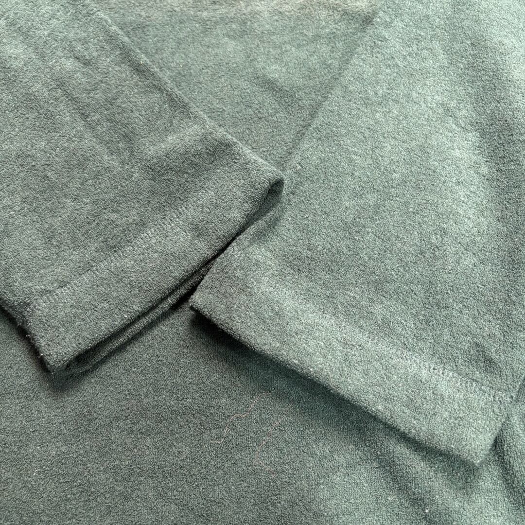 サイズ感は大きめ。肩の落ち方やゆるいシルエットが絶妙で、ボリュームのあるアウターの中にも着やすく、逆に1枚で着ても存在感があります。スウェットとはまた違う質感で、スタイリングに柔らかさと余裕をプラスしてくれる一着。