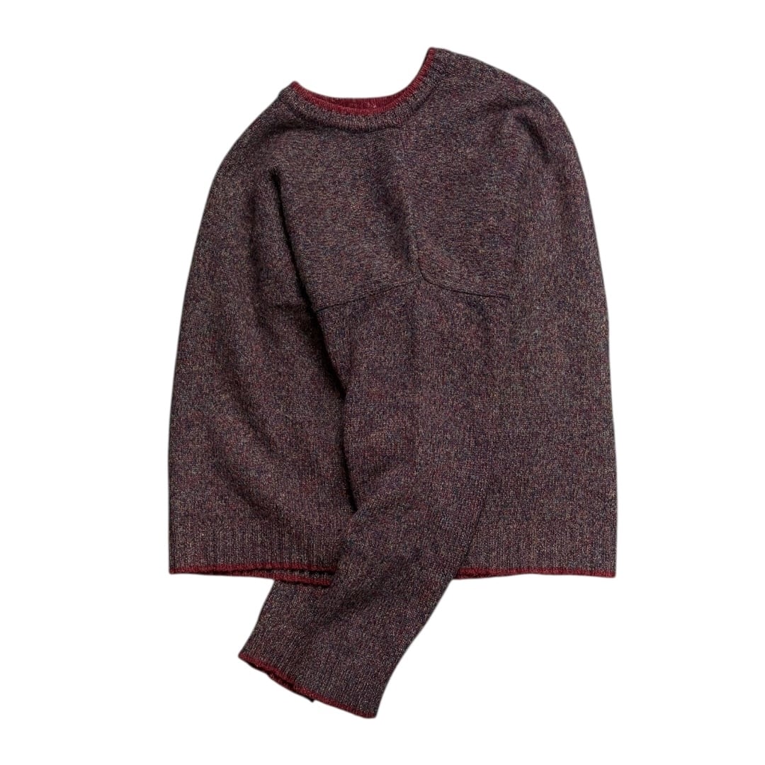赤みがかったブラウンにも、ワインレッドにも見える独特の色味が魅力の、ウールリッチのメランジニット。多色の糸が混ざることで、遠目には落ち着きがありつつ、近くで見ると表情豊かな質感を楽しめます。