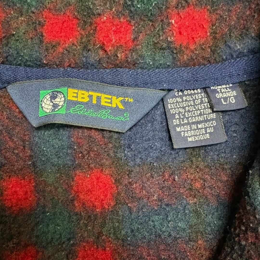 90年代の Eddie Bauer EBTEK、赤とネイビーのクラシックなチェック柄ハーフジッププルオーバー。ヴィンテージのプリネルにありそうなデザインで、フリース素材の柔らかさと保温性を備えた、アウトドアブランドならではの実用的な一枚です。