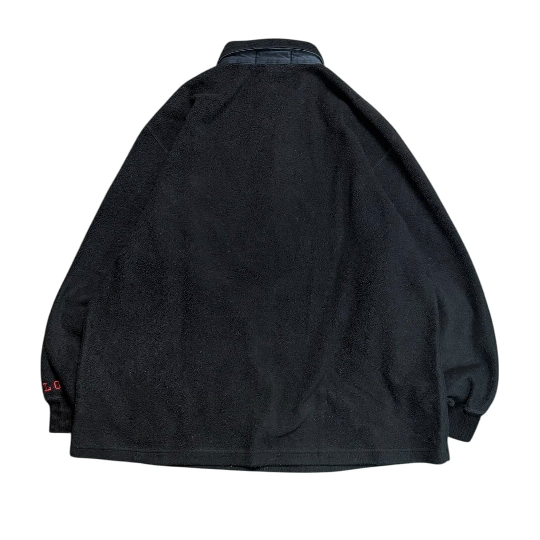 POLO SPORT の黒フリースプルオーバー。襟付き、フロントのボタン。フリースという柔らかな素材に、ほんの少しだけきちんと感を混ぜ込むことで、カジュアルすぎず、でも肩の力が抜けた雰囲気が生まれています。