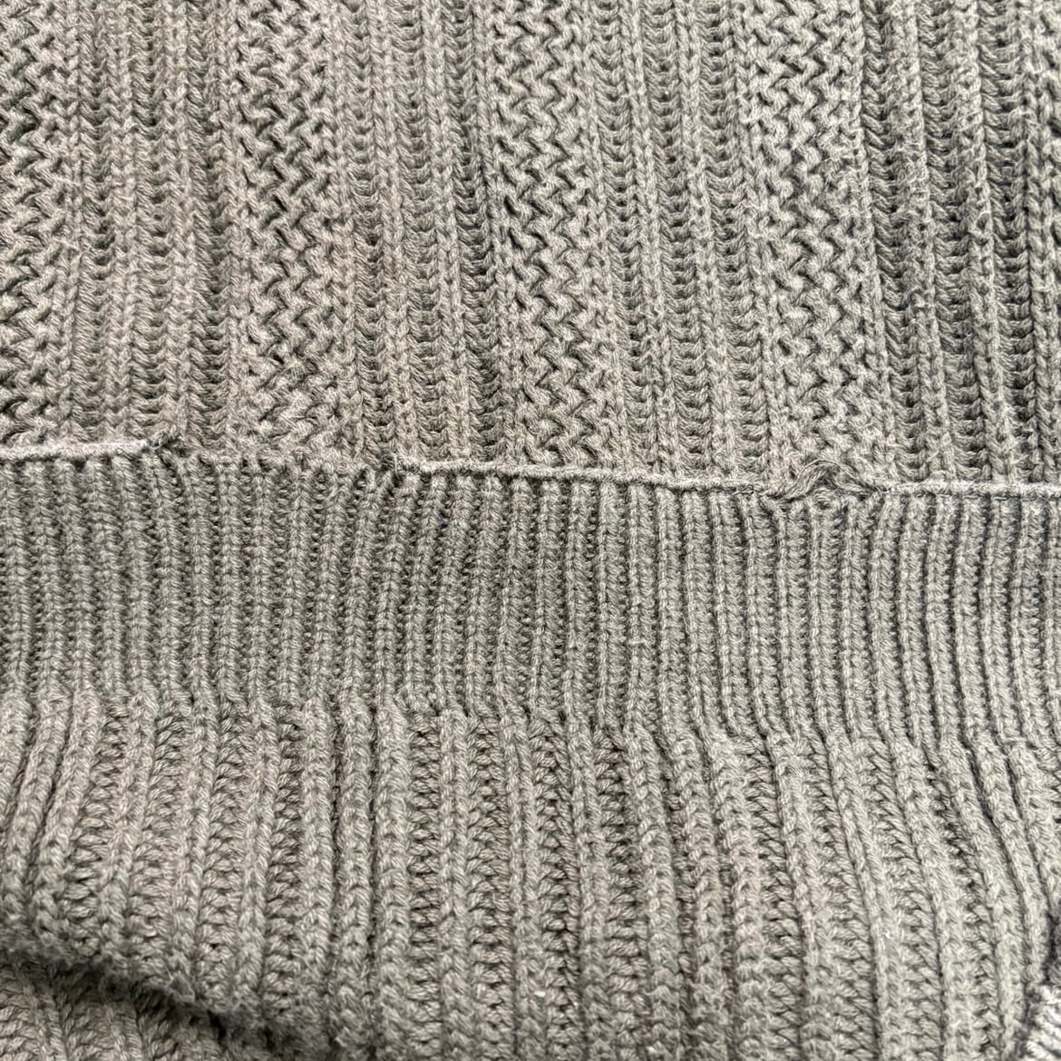90年代エディー・バウアーのコットンニット。一見シンプルなカーキカラーですが、よく見ると縦方向に表情が出るリブ編みの変化パターンが入っており、無地とは明確に違う奥行きがあります。主張しすぎないのに、ちゃんと作られている感じがあるのがこのニットの良さ。