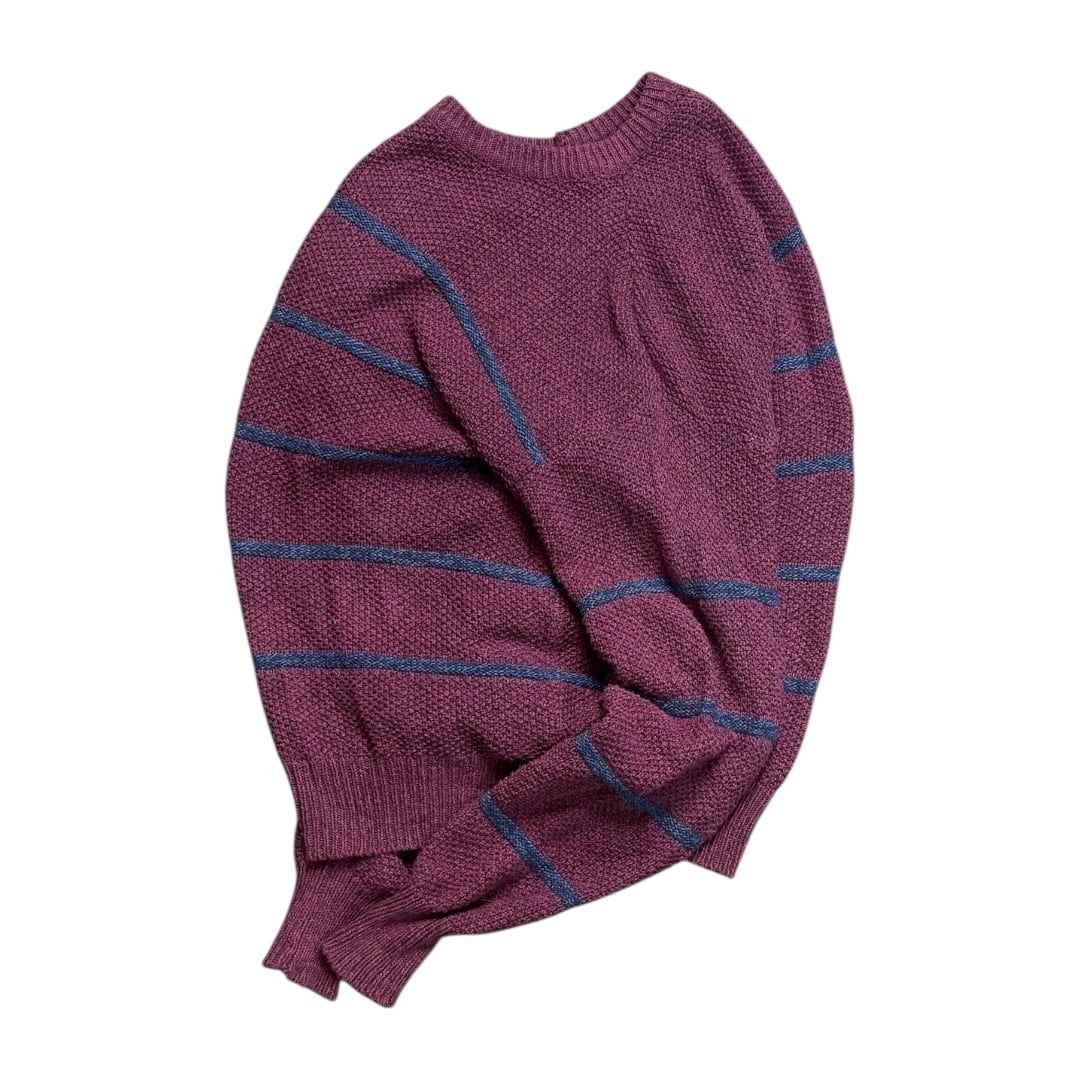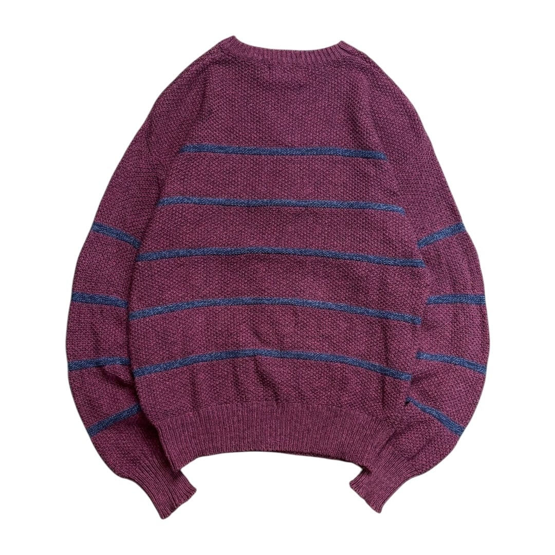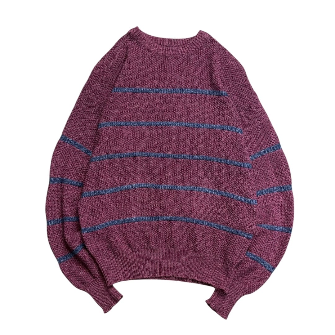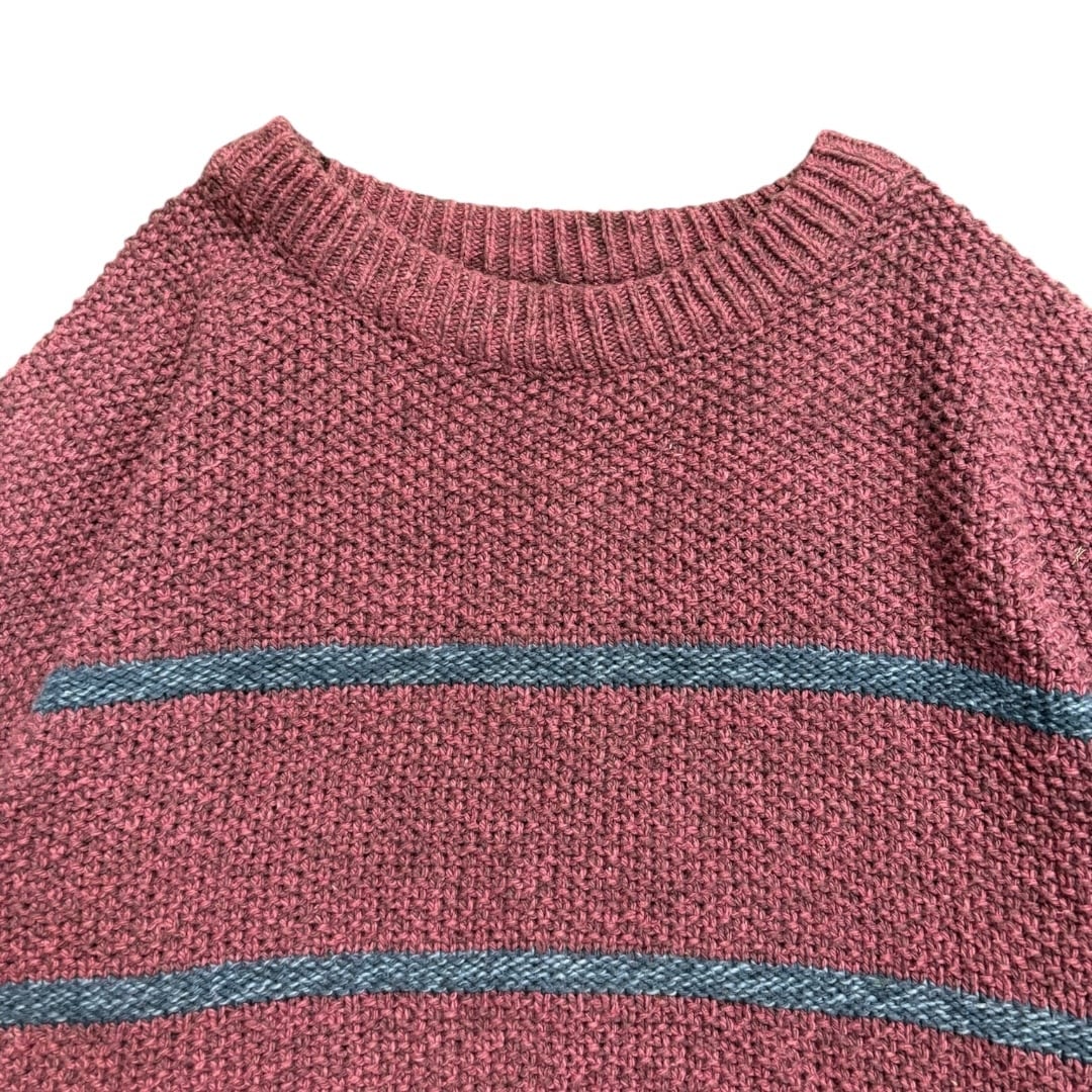 この年代のEddie Bauerらしく、アウトドアブランドらしい堅実なつくりと、日常着としてのバランス感覚がうまく共存しています。派手さはないですが、色味とピッチの細いボーダーのおかげで、無地ニットとは違う奥行きがあり、古着ならではの雰囲気を楽しめます。