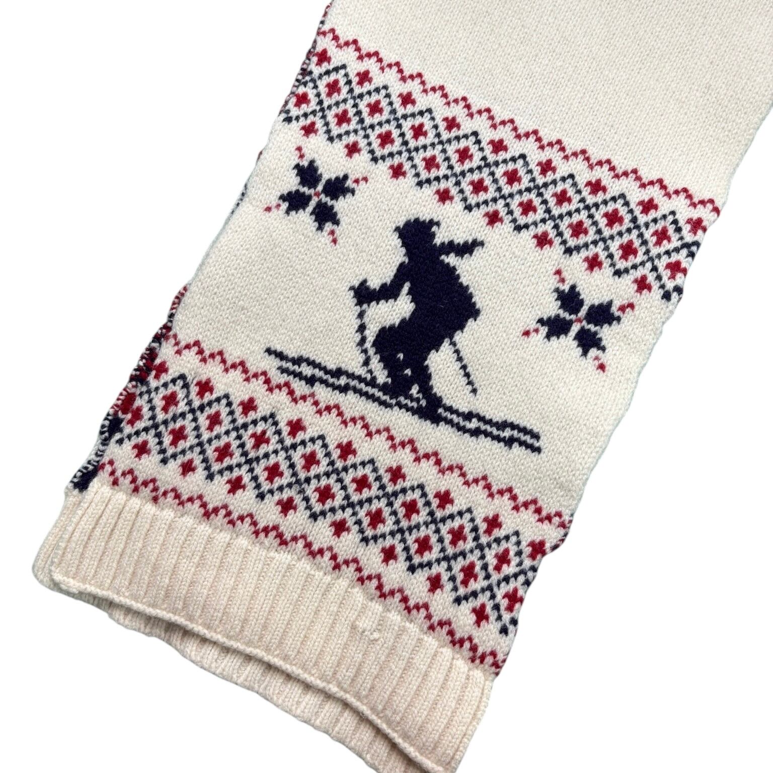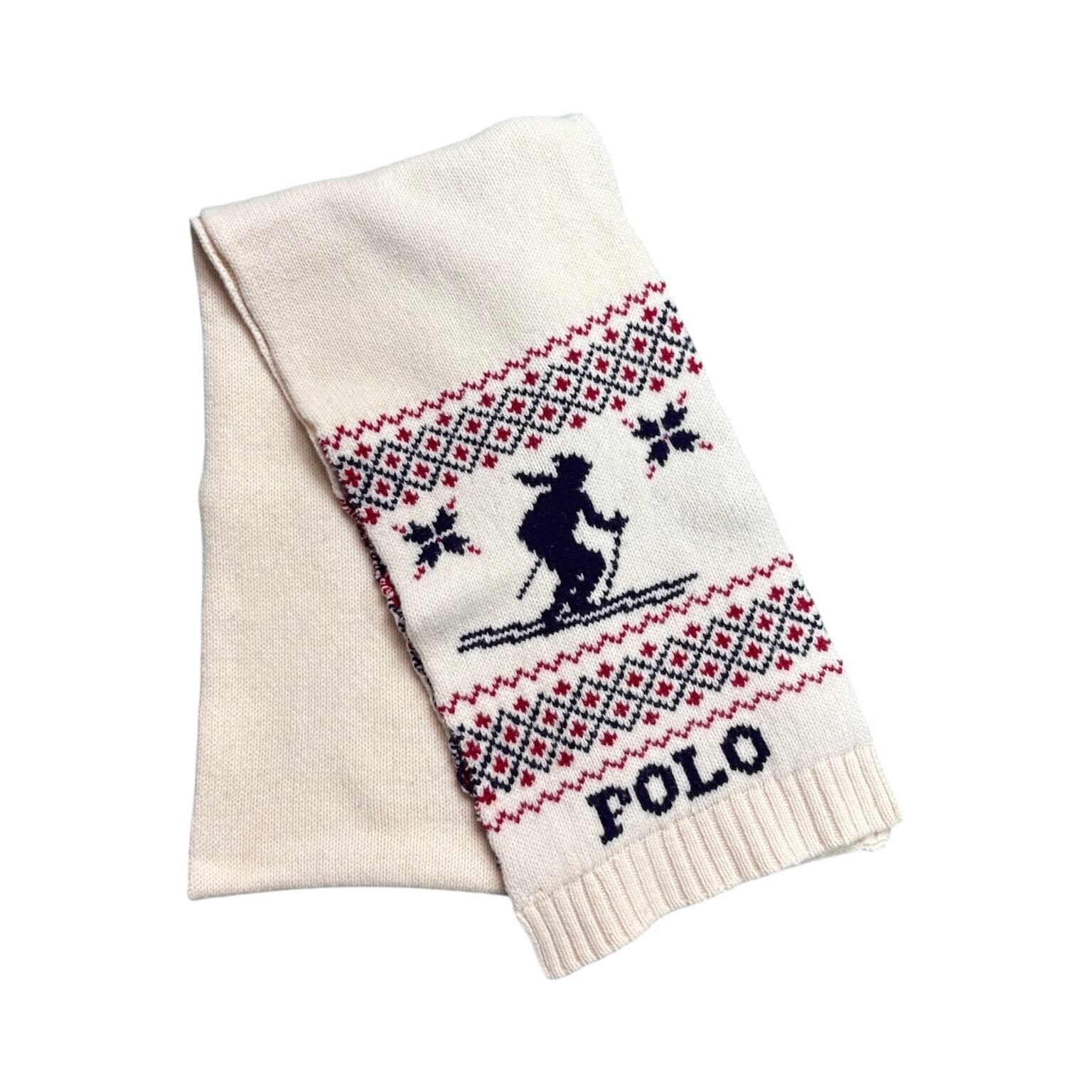 スキーをする人物モチーフが配されたデザインで、雪山やウィンターリゾートの空気感をそのまま落とし込んだような一枚です。アウトドアやスポーツの世界観を、あくまで上品に、クラシックに表現するのはラルフ・ローレンの真骨頂ですね。