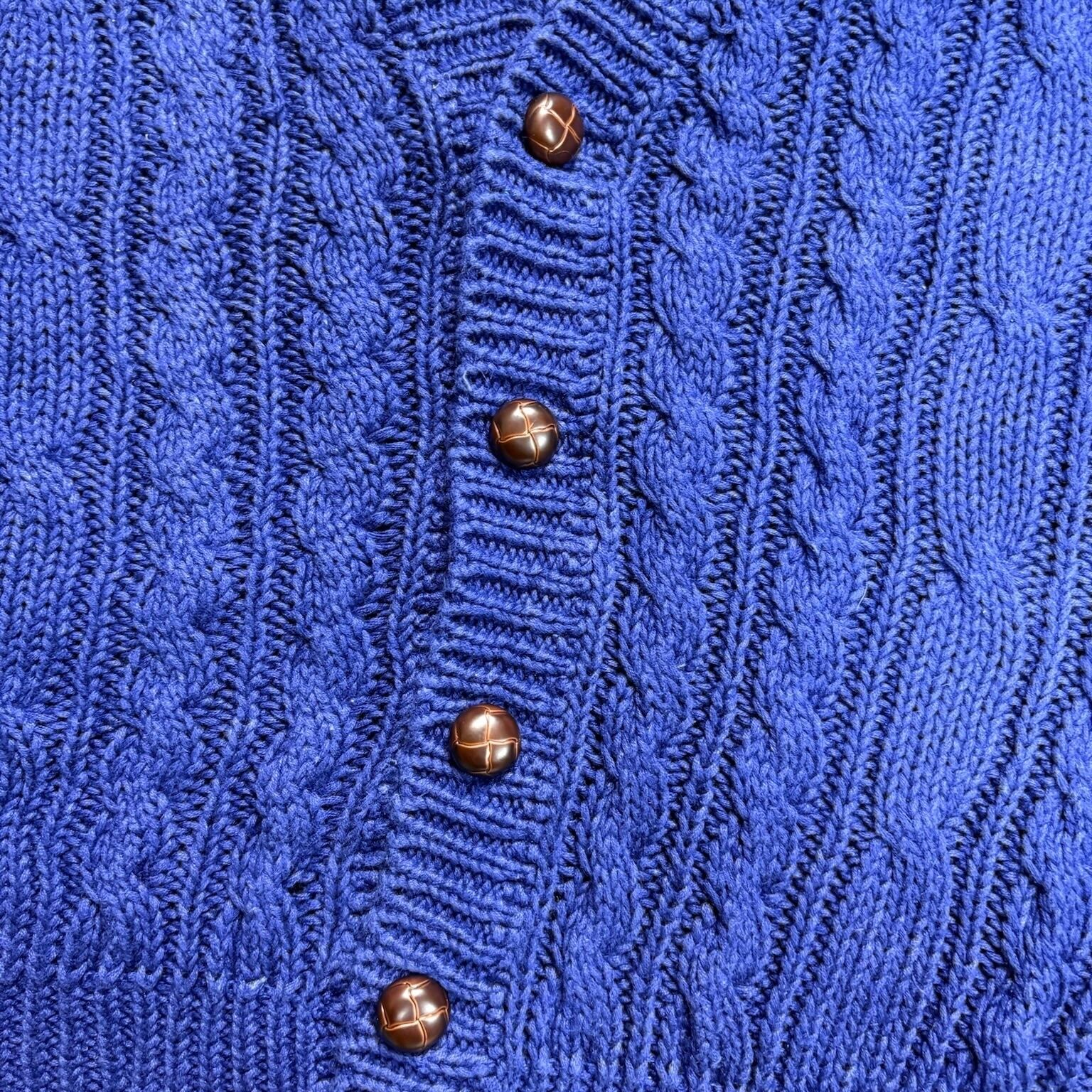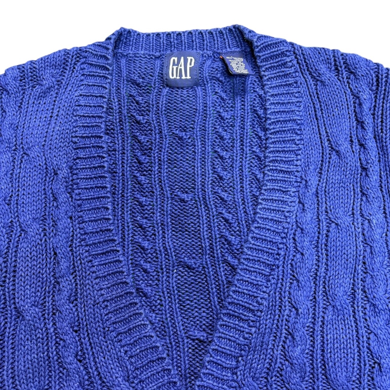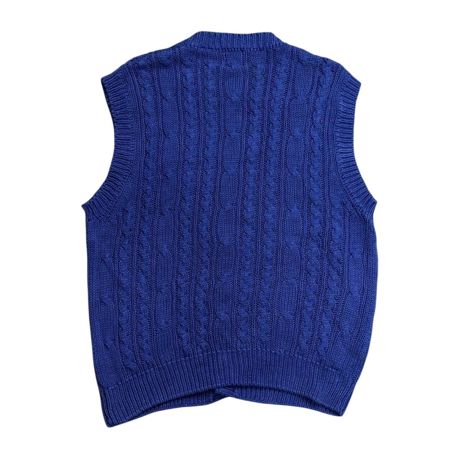90年代GAPらしい、シンプルだけどしっかり使えるケーブルニットベスト。カラーは落ち着いたブルーで、主張しすぎないのにコーディネート全体をきちんと引き締めてくれます。