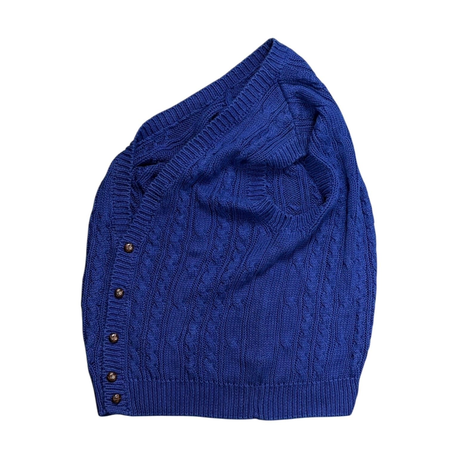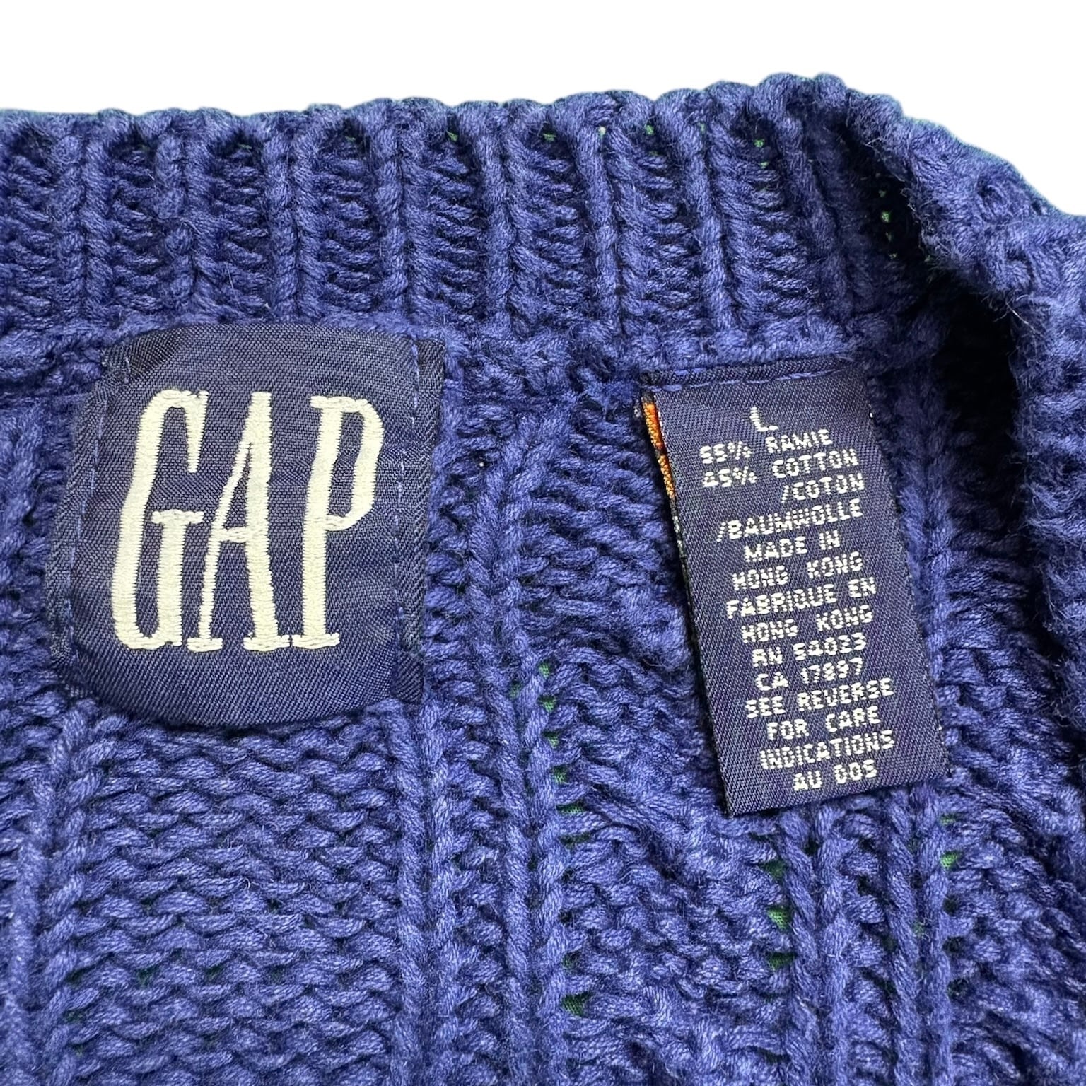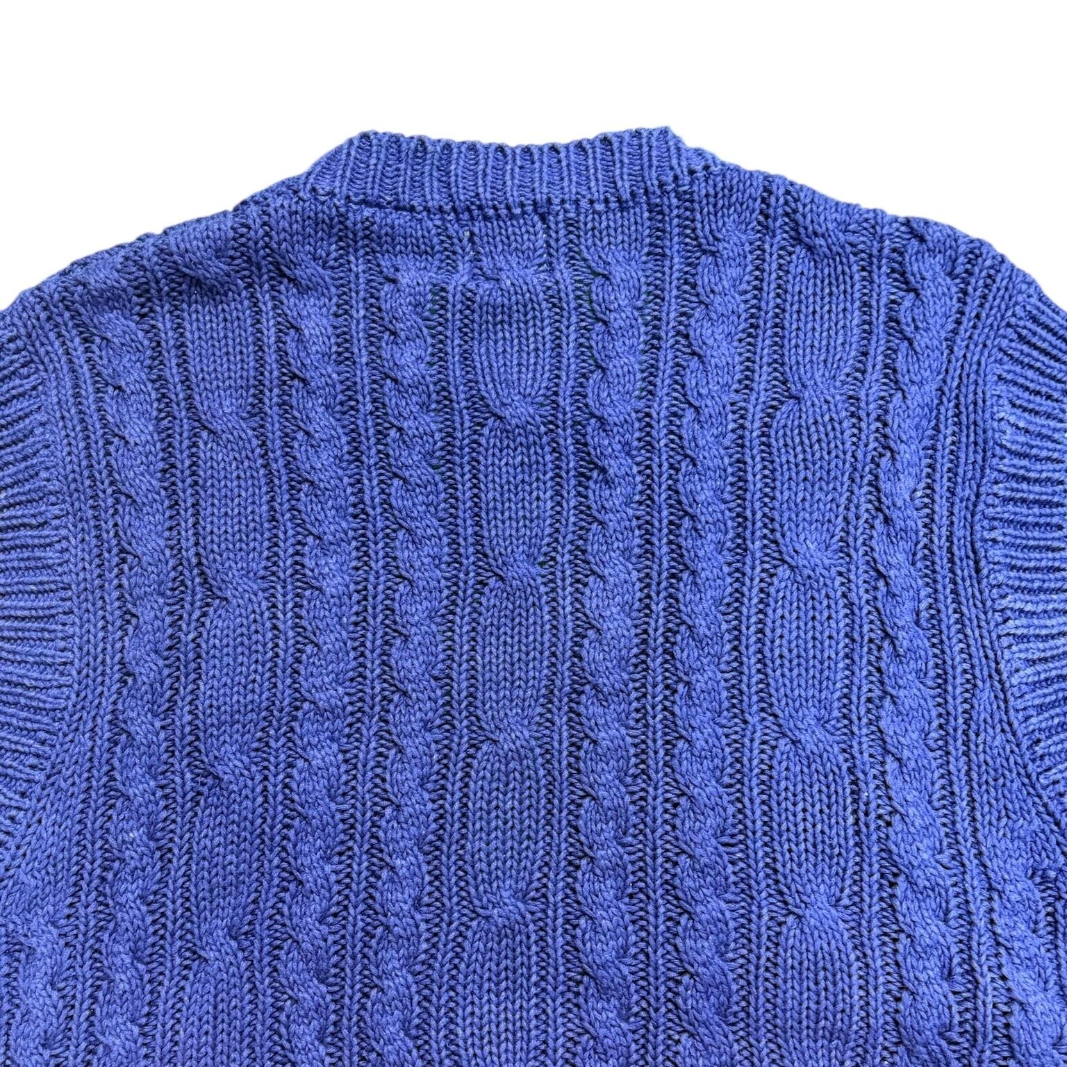90年代GAPらしい、シンプルだけどしっかり使えるケーブルニットベスト。カラーは落ち着いたブルーで、主張しすぎないのにコーディネート全体をきちんと引き締めてくれます。