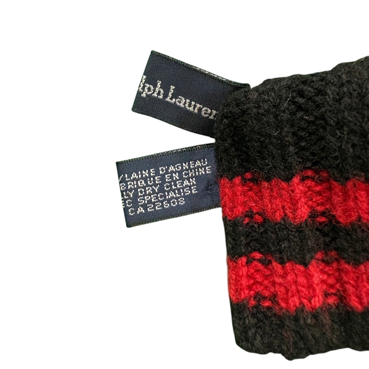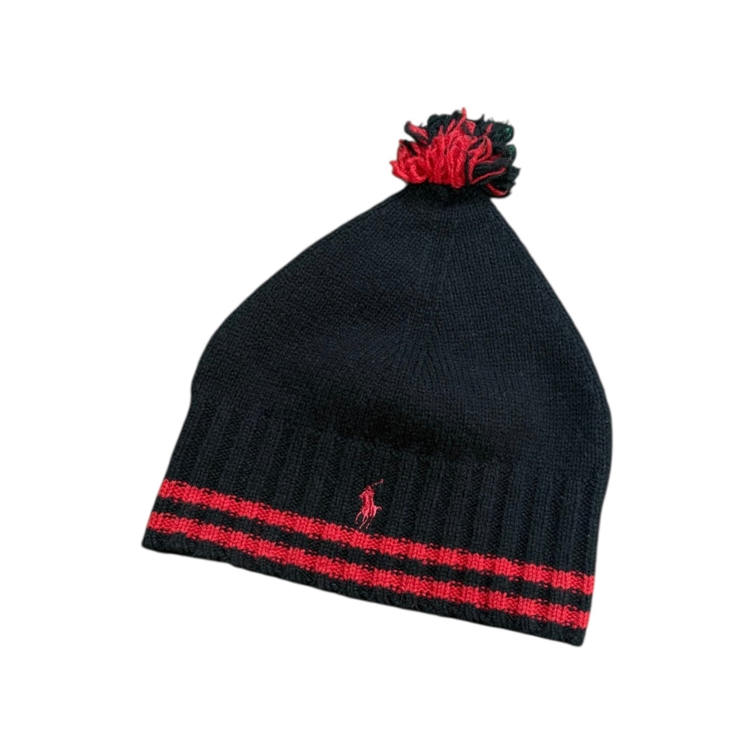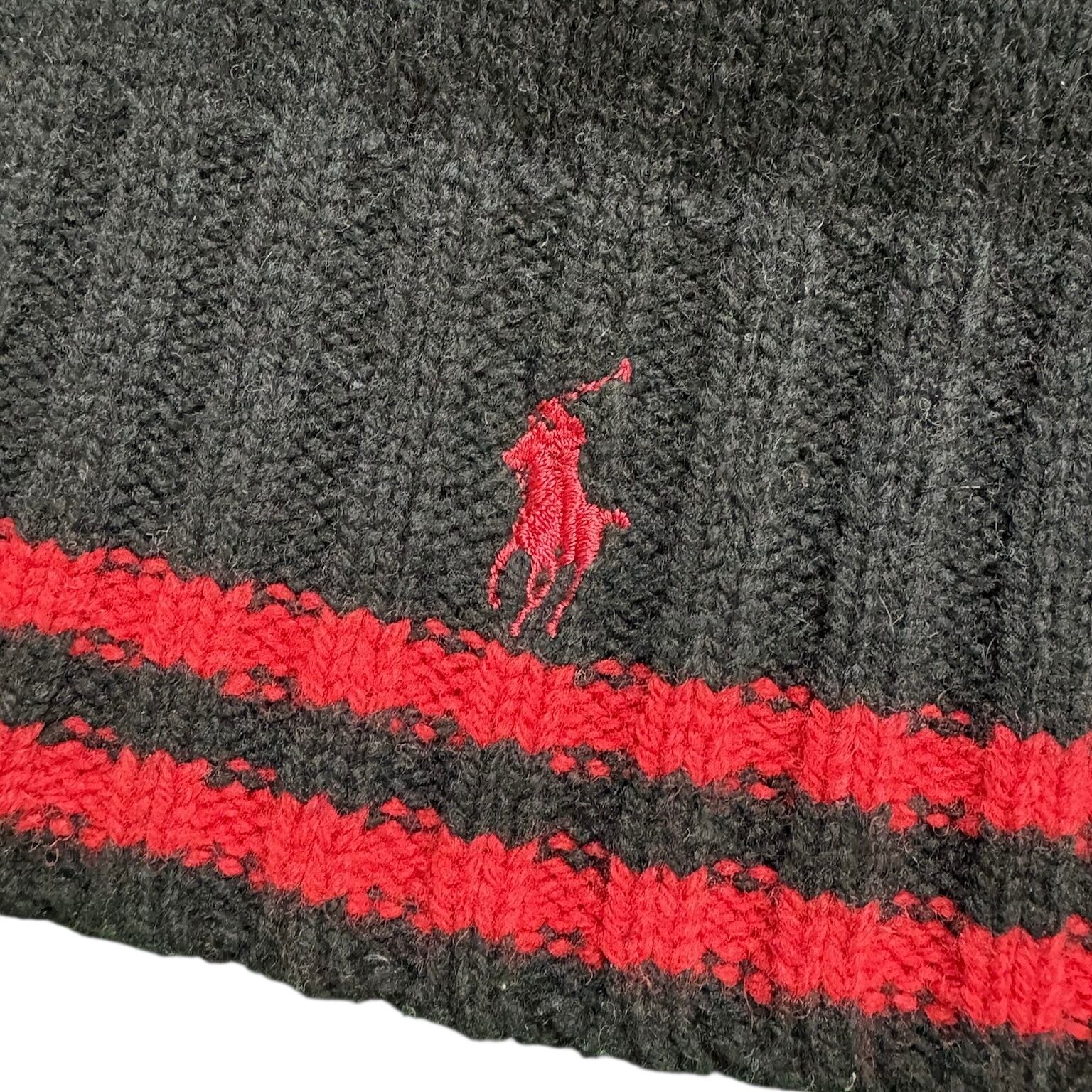 ブラックボディに、リブ部分の赤い2本ライン。そこにポンポン、そしてしっかりポニーロゴ入り。ラルフらしいアイコン性がきれいに詰まったウールニットキャップです。要素は多いのに、うるさくならず上品にまとまっているのはさすがのバランス感。
