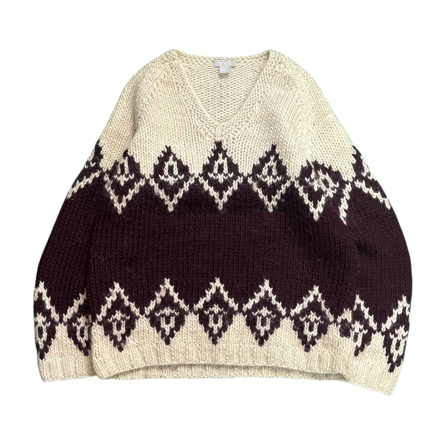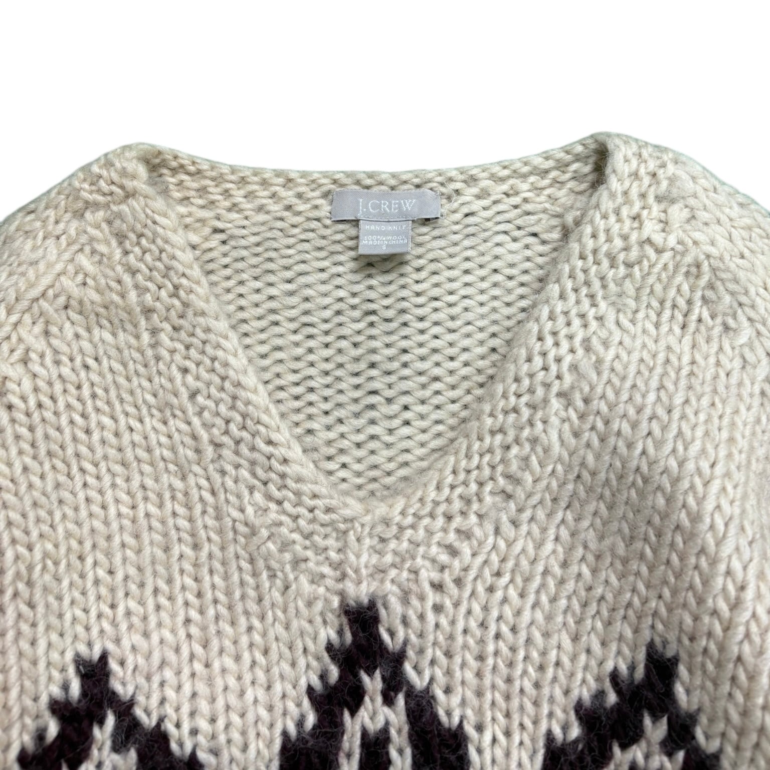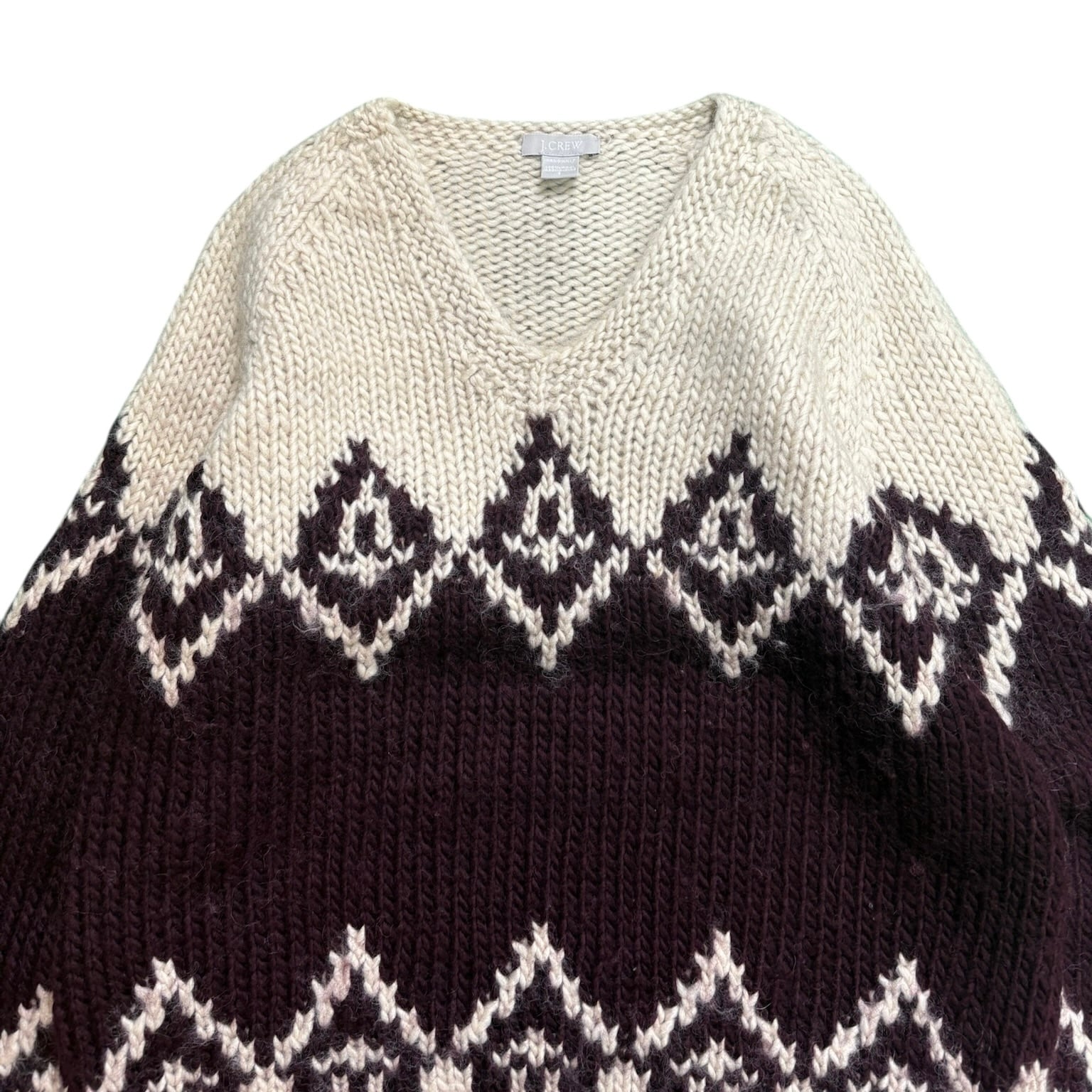 00年代J.CREWの中でも、ひときわ存在感のある「HAND KNIT」表記のウールVネックニット。ざっくりと編まれた厚みのある生地で、手編みならではの立体感がしっかり伝わってきます。触った瞬間に「これはいいな」と分かる、古着らしい説得力のある一枚です。