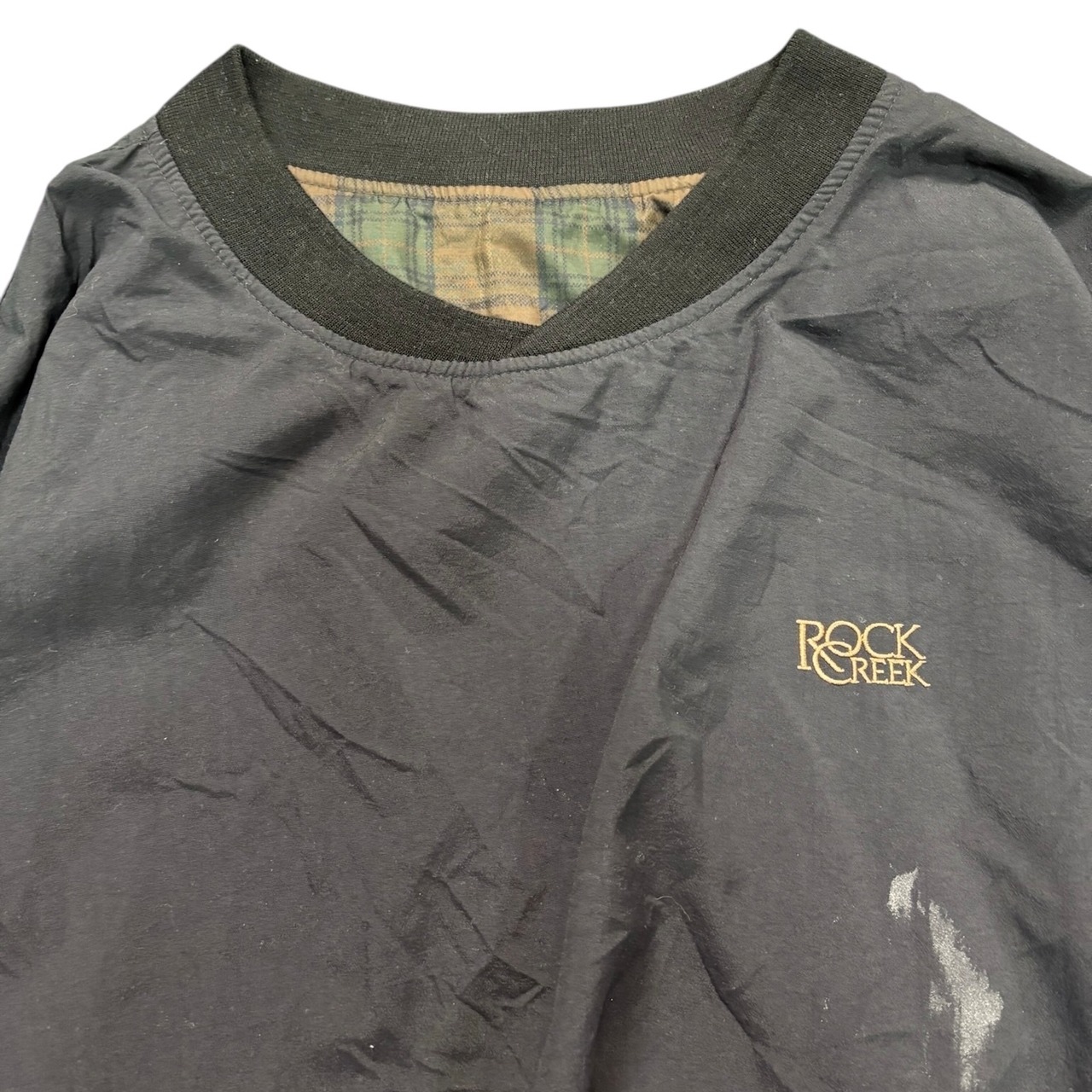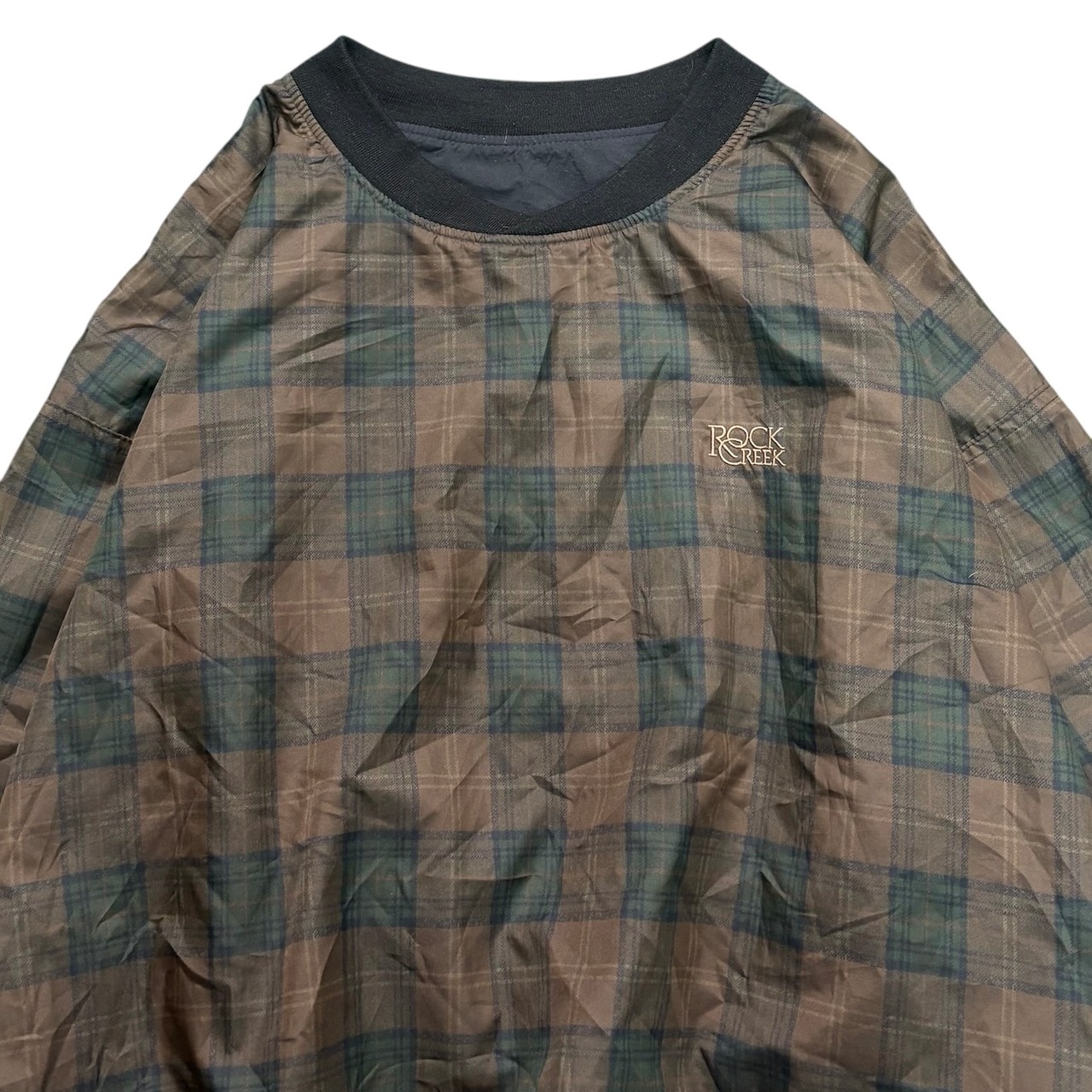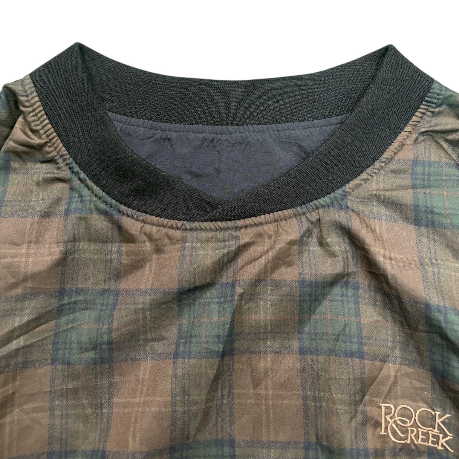 90年代の「ROCHE」リバーシブルピステ。片面は落ち着いたチェック柄、もう片面は「ROCK CREEK」の刺繍だけの無地で、シンプルながら存在感があります。ピステは機能重視でスポーティなものが多いですが、これはファッション的にも映える一枚です。