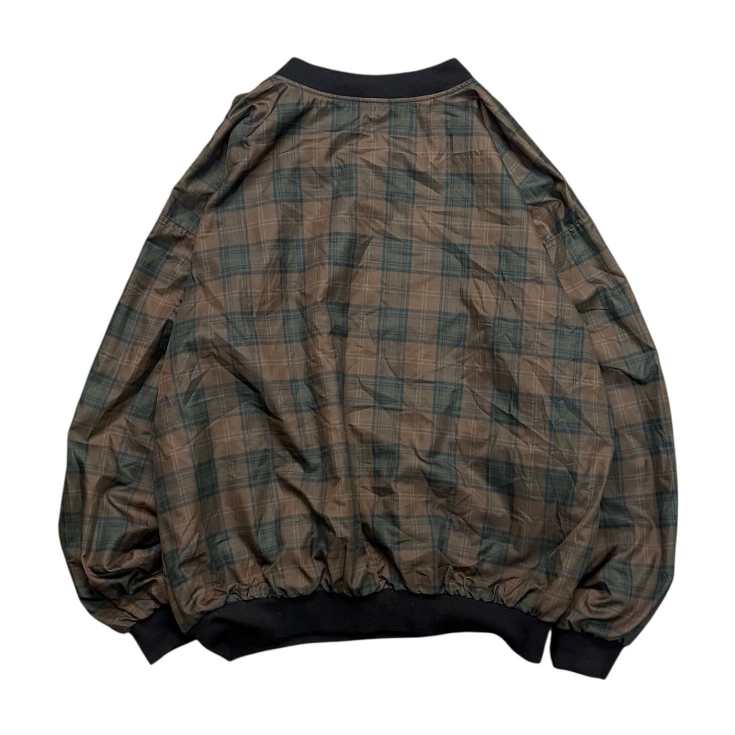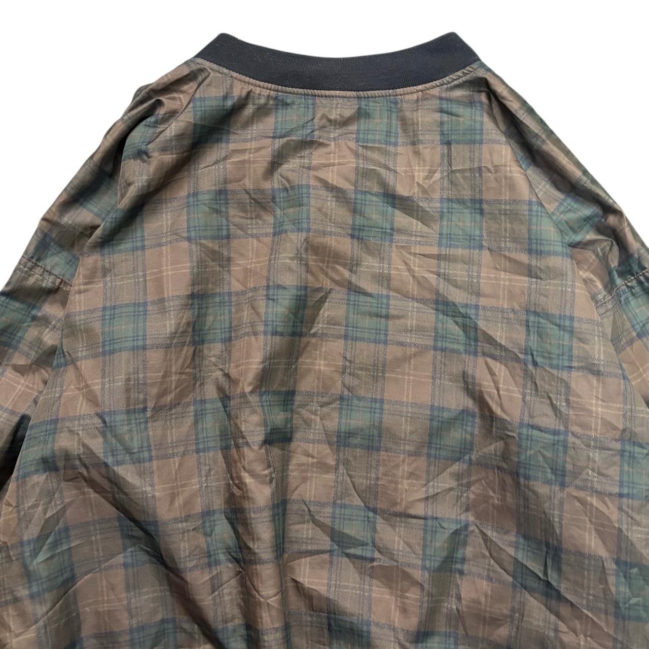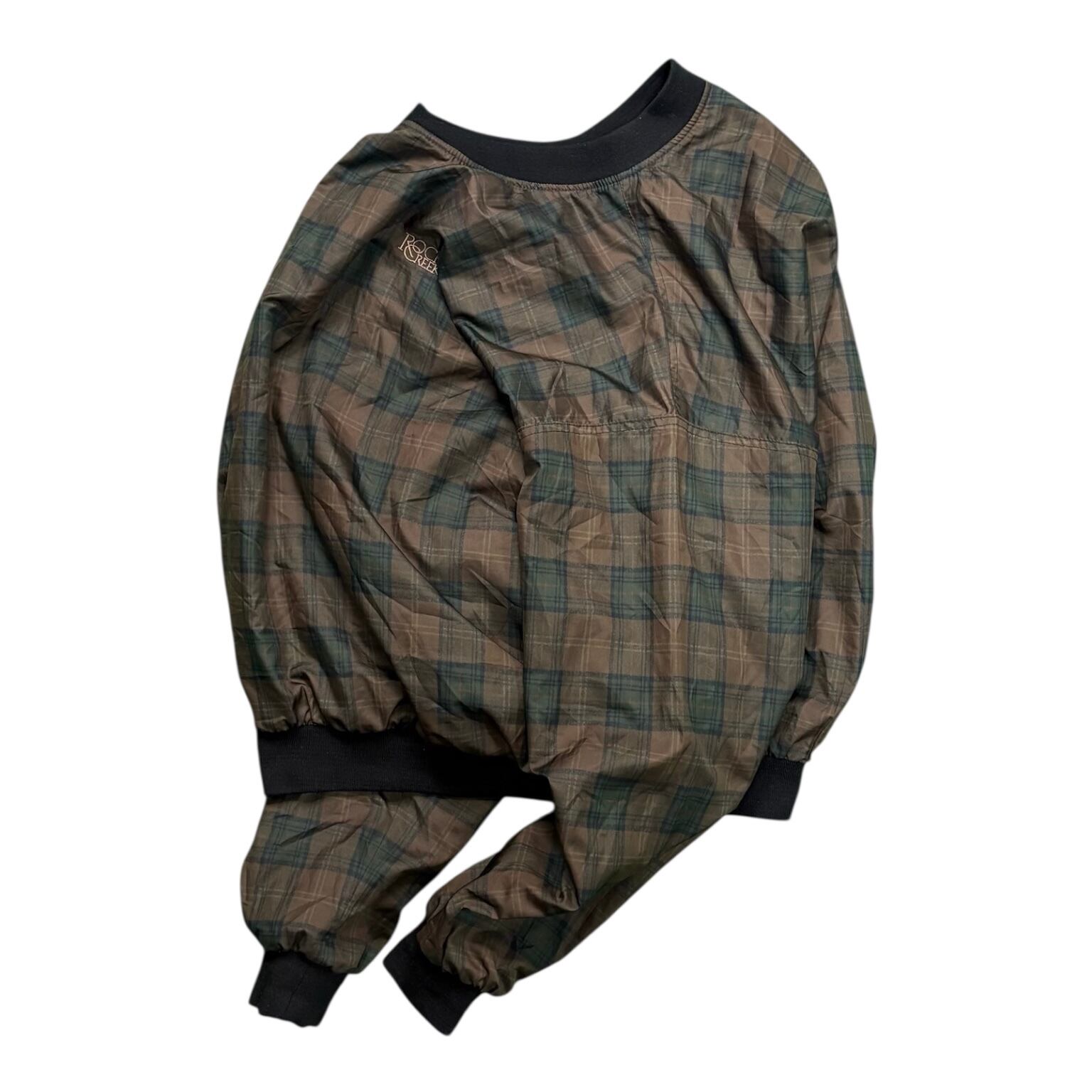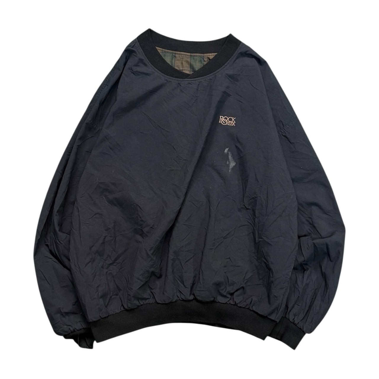 90年代の「ROCHE」リバーシブルピステ。片面は落ち着いたチェック柄、もう片面は「ROCK CREEK」の刺繍だけの無地で、シンプルながら存在感があります。ピステは機能重視でスポーティなものが多いですが、これはファッション的にも映える一枚です。