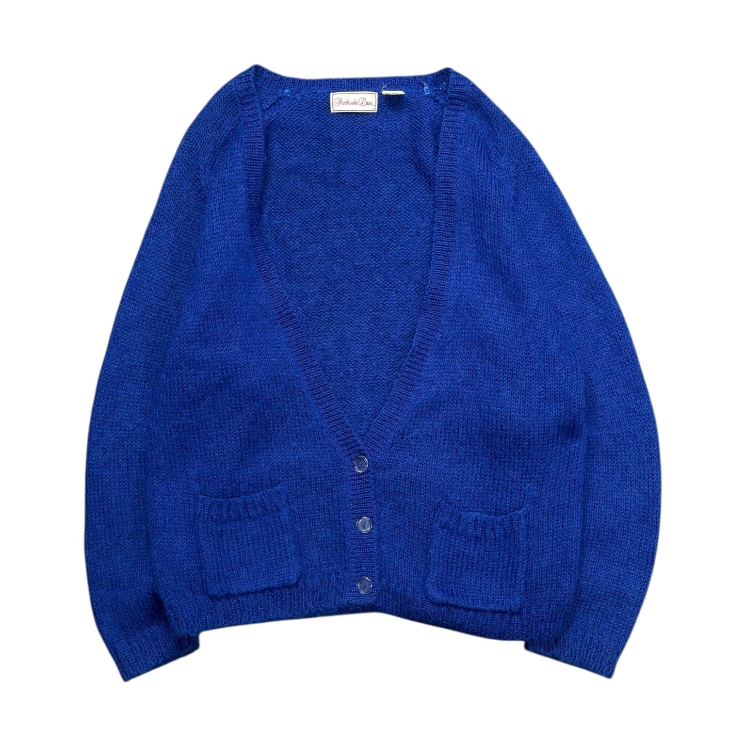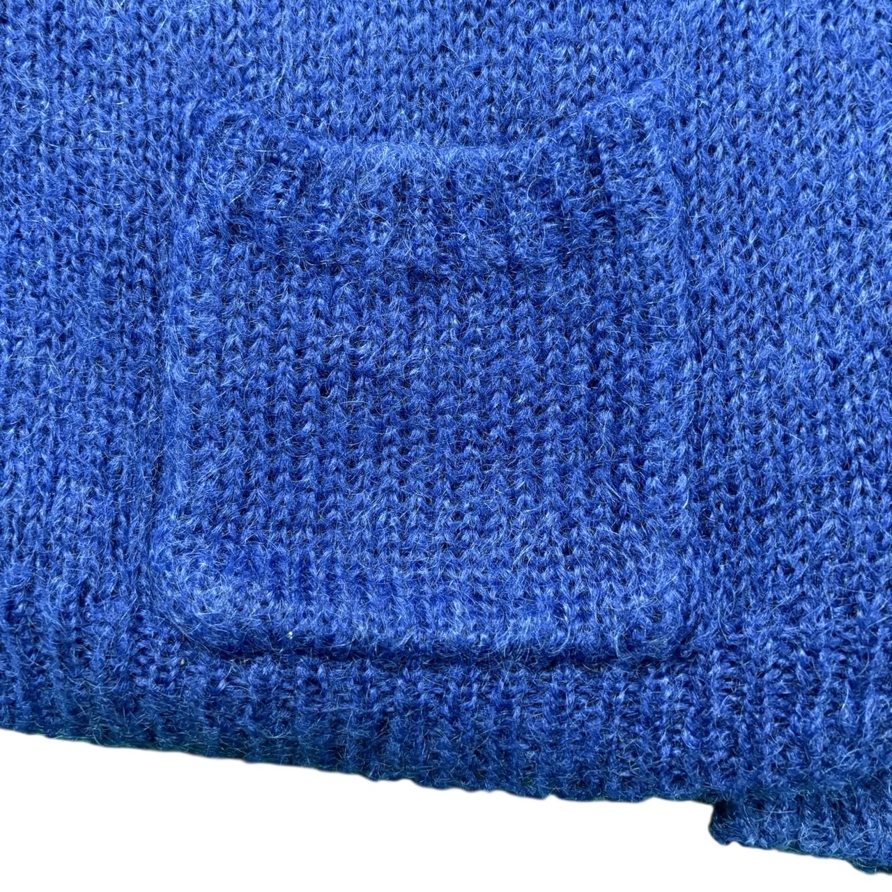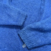モヘア50%。色も派手すぎない青で、意外と合わせやすいと思います。サイズ感も悪くないです。着丈62.5cm、身幅57cm。短すぎず、細すぎず、今着るならちょうどいいところ。シャツの上でも、ロンTの上でも成立します。