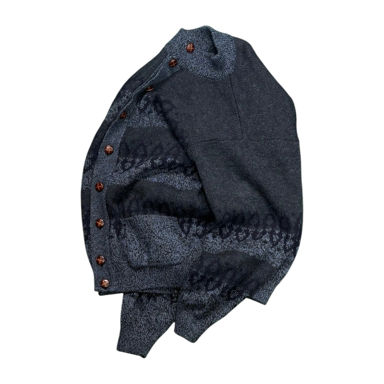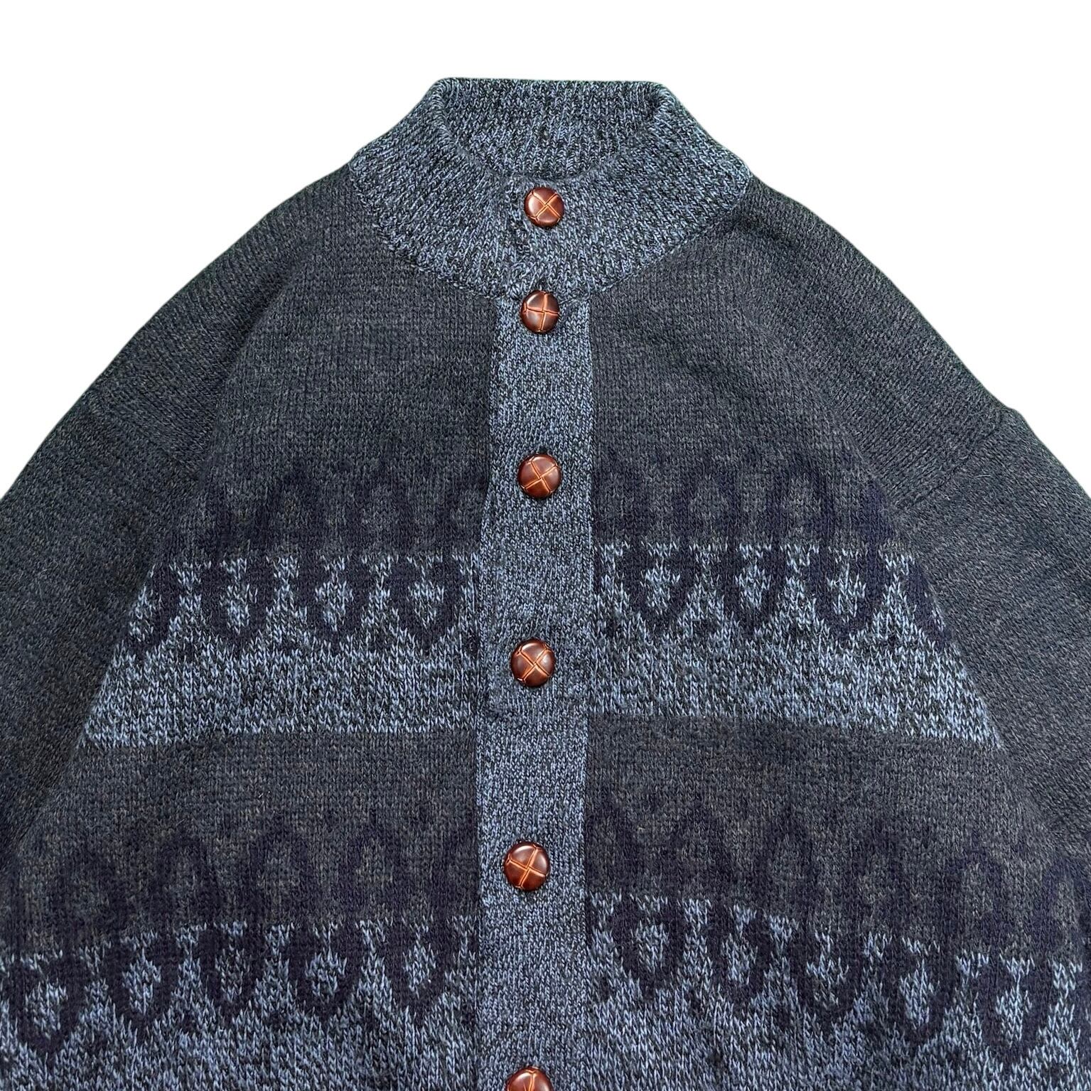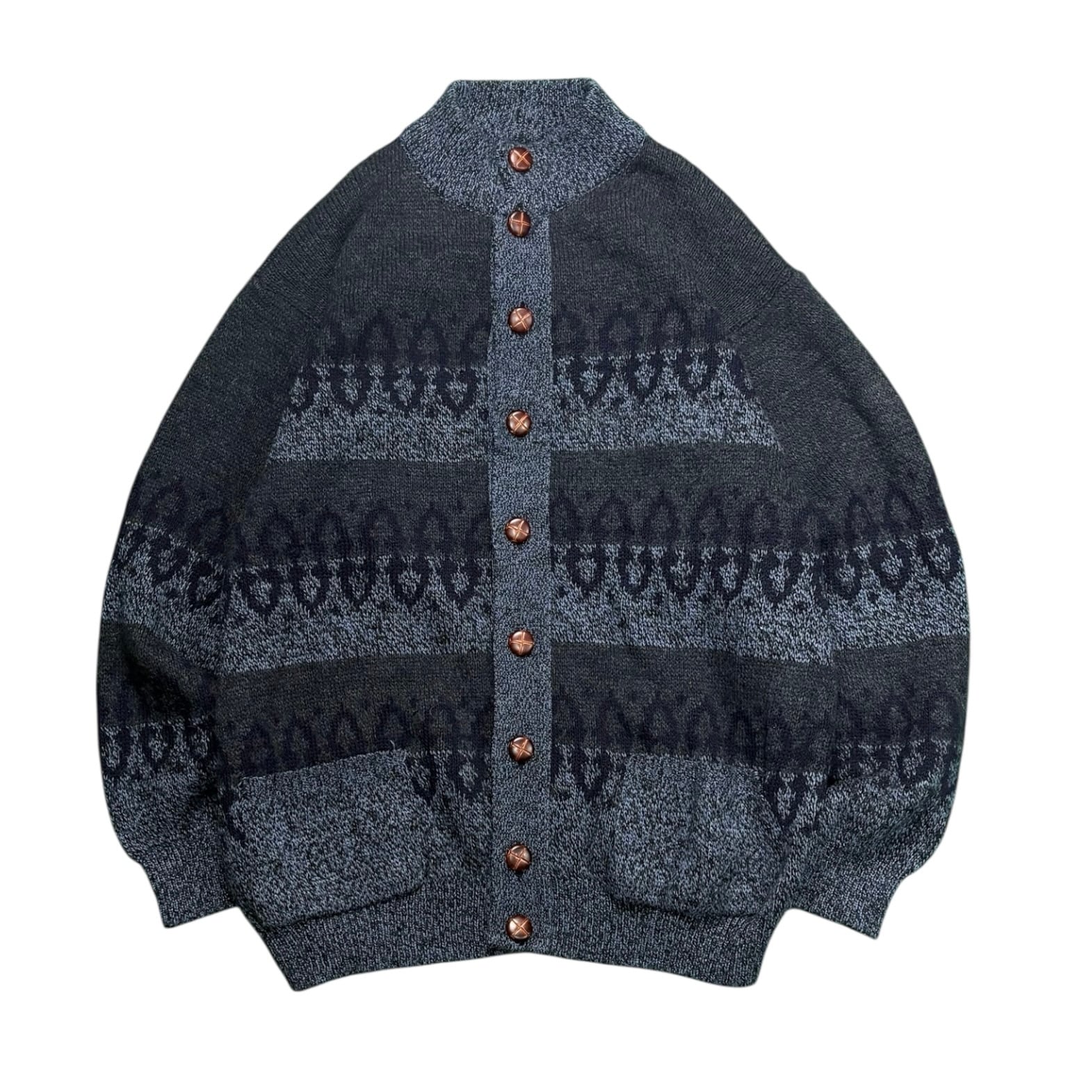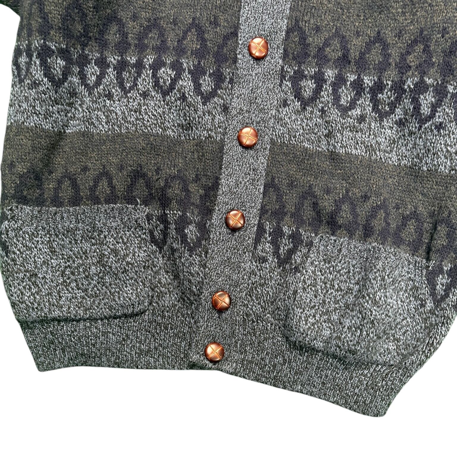 落ち着いたトーンの総柄ニットカーディガン。