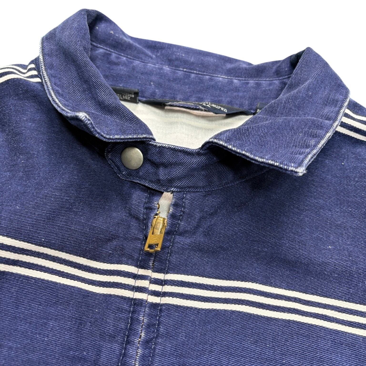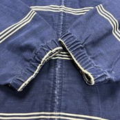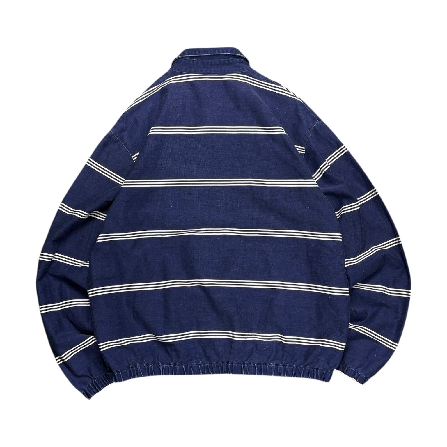 形は王道のスイングトップ。短丈で身幅はしっかり広く、裾のリブで丸みのあるシルエットを作るクラシックなバランス。デニム生地というだけで少し無骨になりますが、そこに細いボーダーが入ることで抜け感が生まれ、重くなりすぎない絶妙な塩梅に仕上がっています。