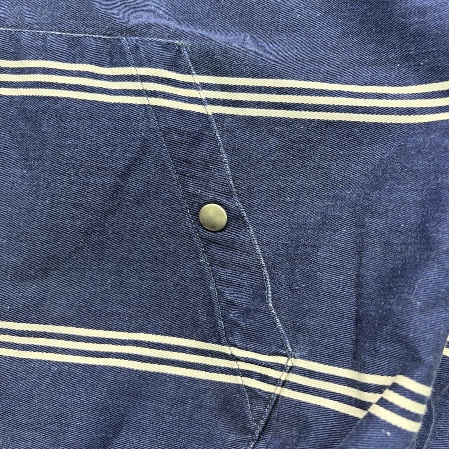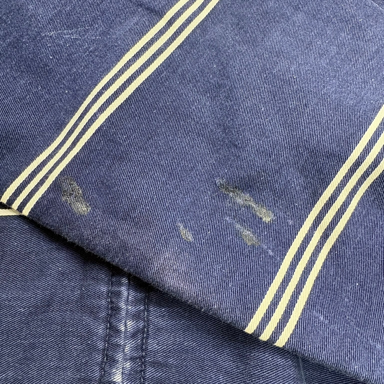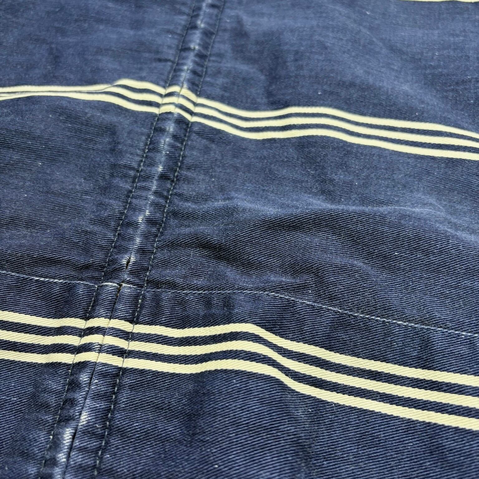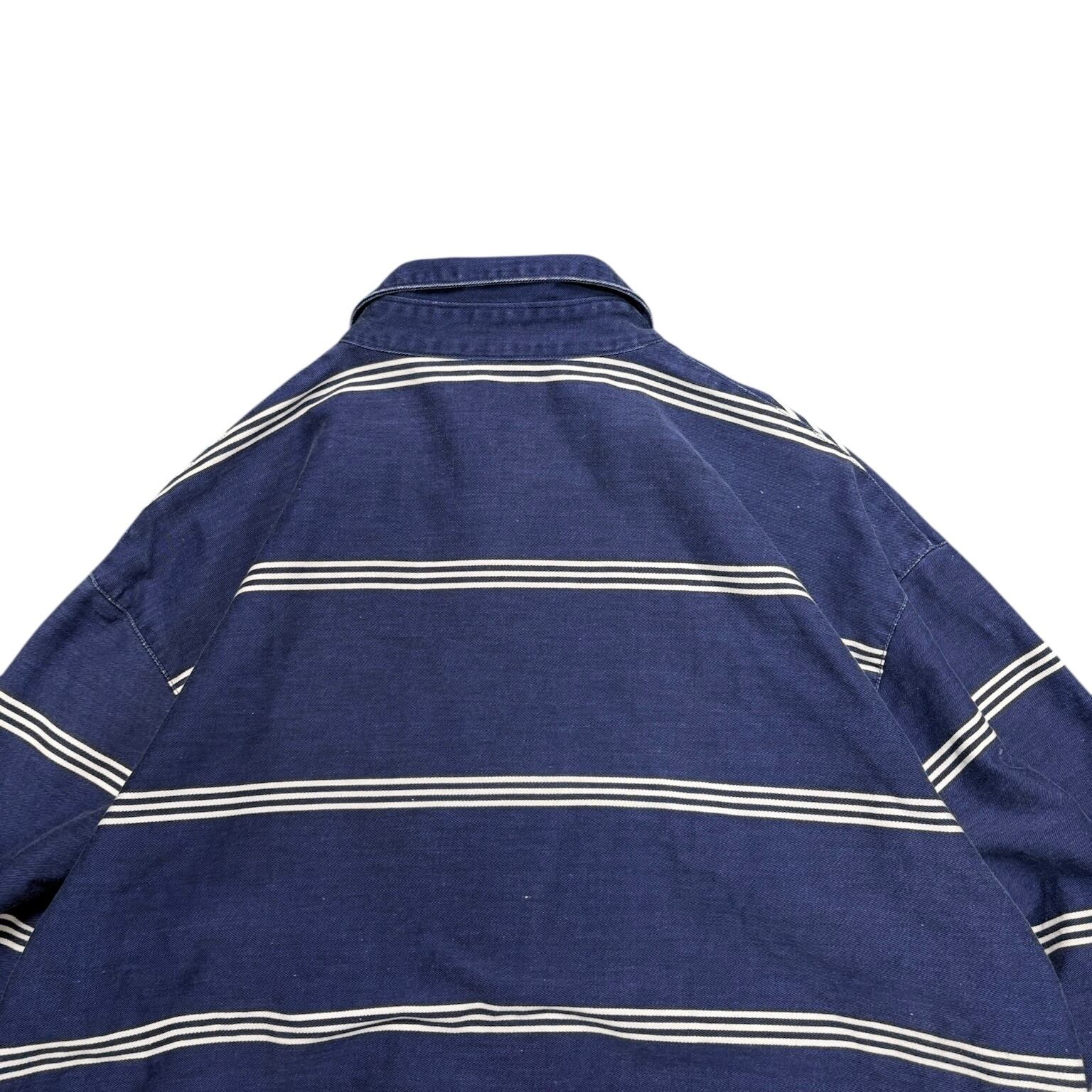 一見すると爽やかなネイビーのボーダーですが、デニム生地特有のムラ感とフェードが乗ることで、ただのマリンテイストでは終わらない奥行きが出ています。いわゆる上品なカジュアルに収まりきらない、ラフさと土臭さが同居しているのがこの一着の魅力。