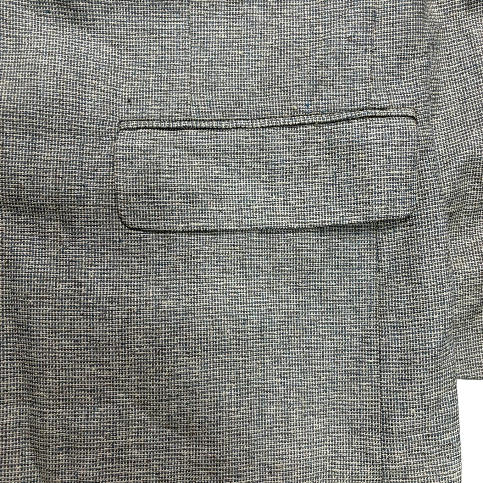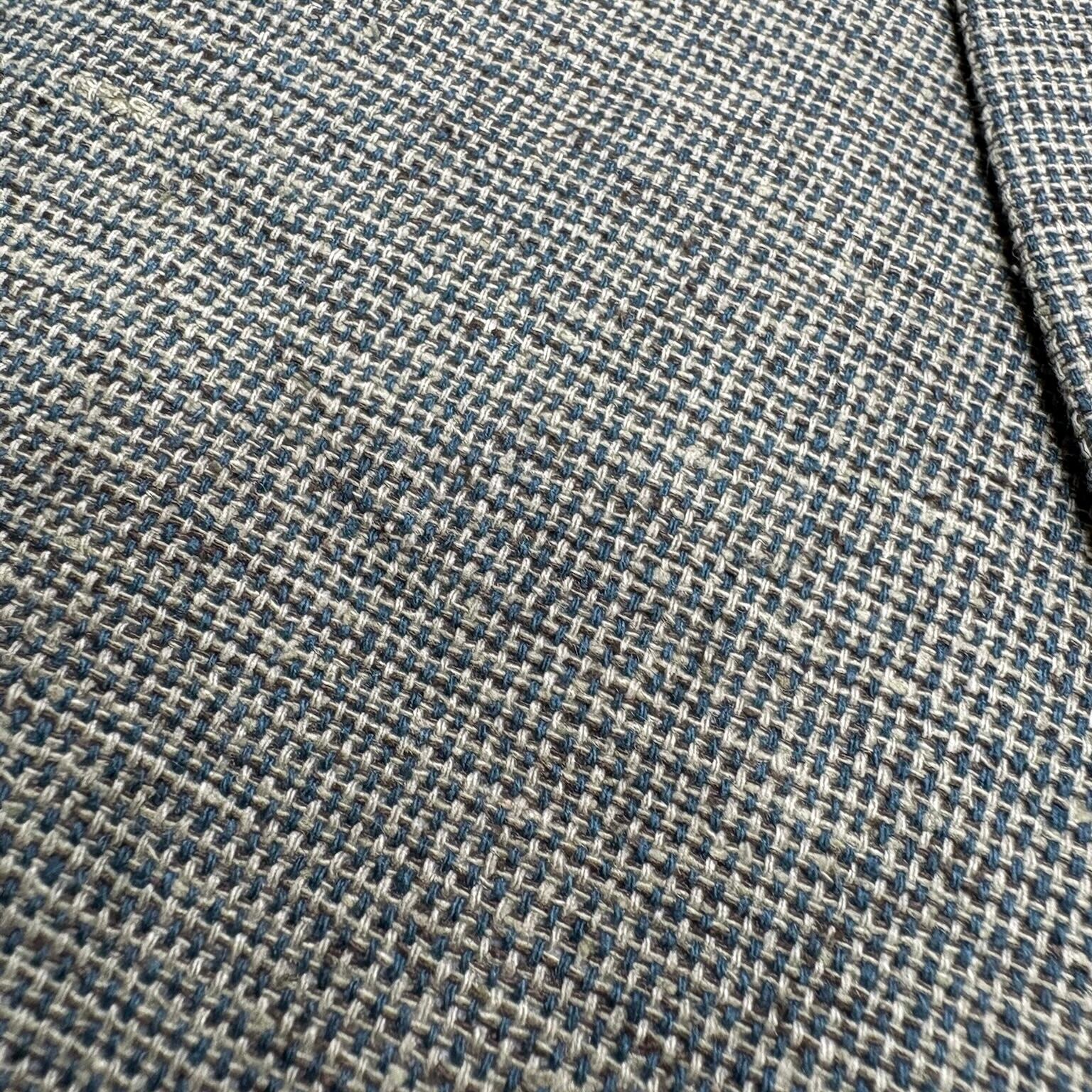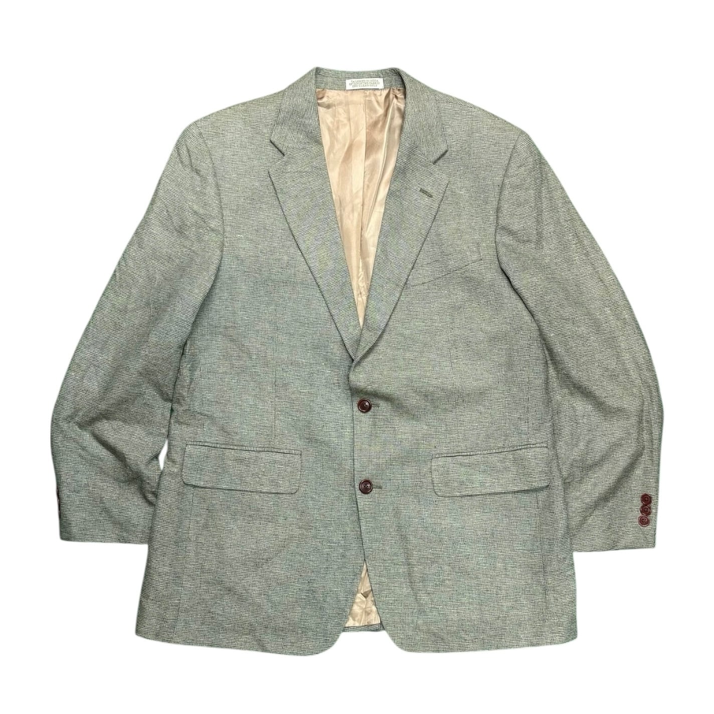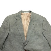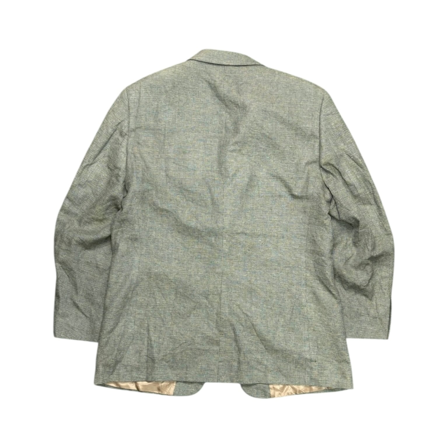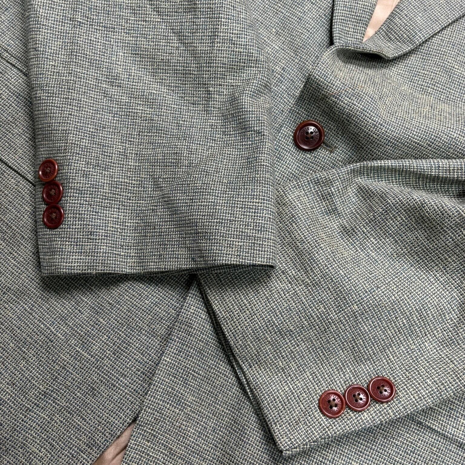 この一着でまず目を引くのは、淡いセージグリーンのようなニュアンスを帯びた柔らかな色味と、奥行きのある表情。無地に見えて実はしっかりと生地に動きがあり、近くで見るほど良さが伝わるタイプです。派手ではないのに印象に残る、その地味すぎない渋さがとても良い。古着のテーラードにありがちな堅さが薄く、肩肘張らずに羽織れるのも魅力です。