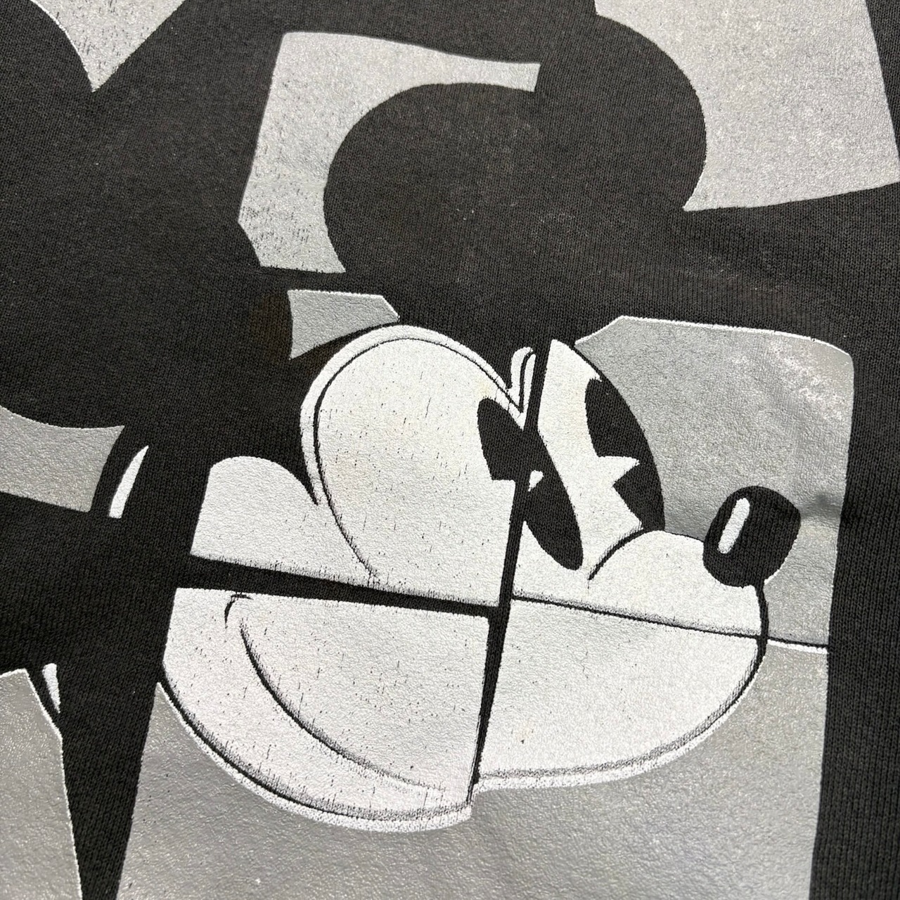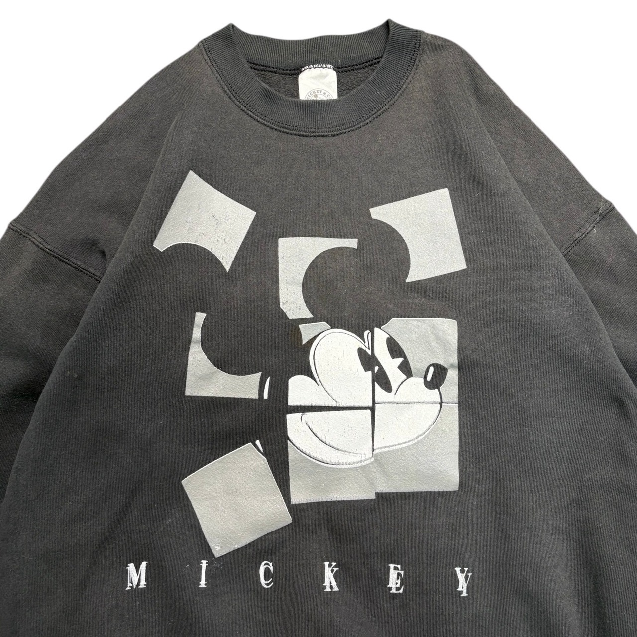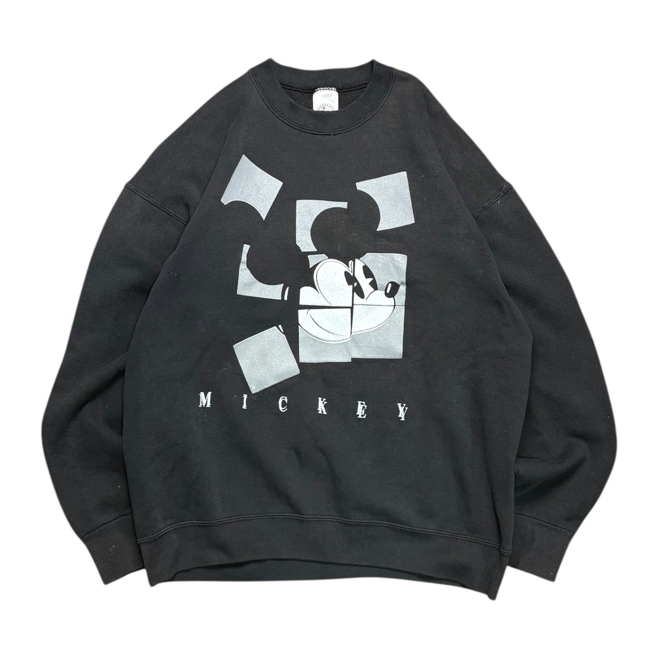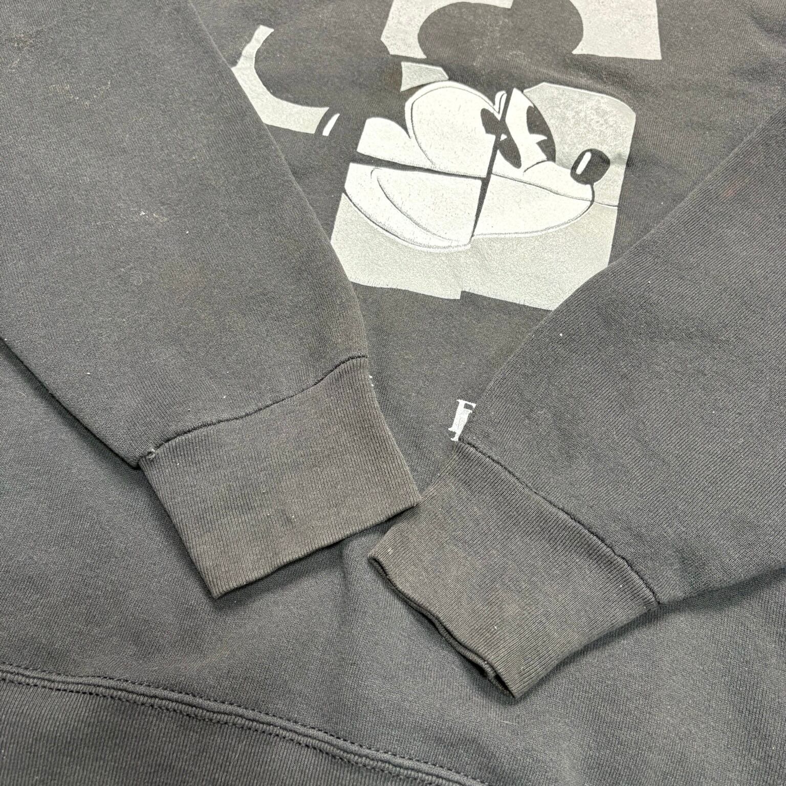 キャラクター物でありながら、いわゆるかわいい古着の枠に収まりきらない、かなり良いバランスの一着です。ブラックボディに、ミッキーの顔を幾何学的に切り取ったようなアートワークが乗ることで、ポップさよりもむしろグラフィックとしての完成度が前に出ている。ディズニーらしい親しみやすさは残しつつ、90年代らしいデザイン感覚がしっかり反映された、ただのキャラスウェでは終わらない空気を持っています。
