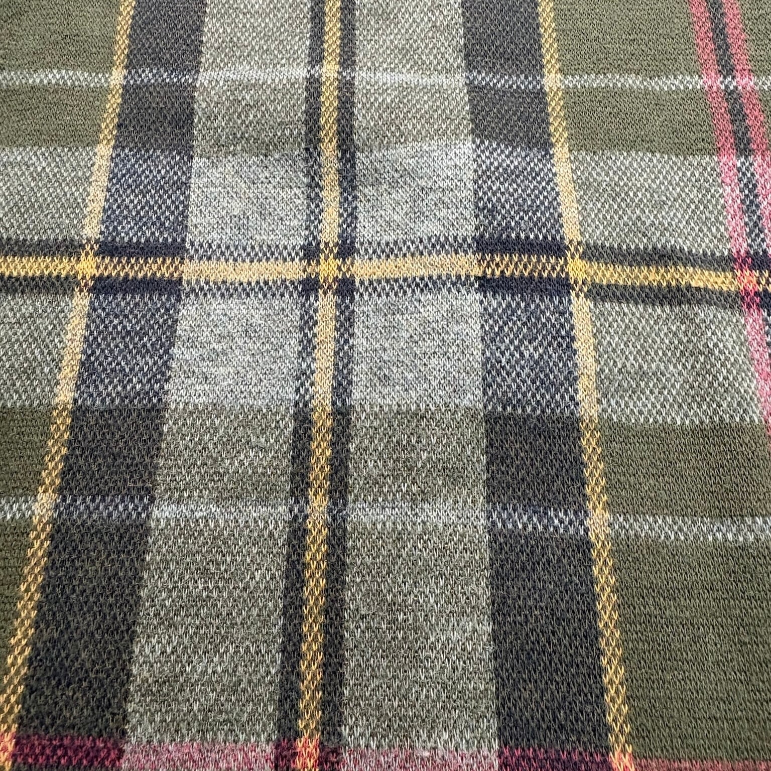 オリーブを基調に、グレー、ネイビー、イエロー、ピンクが走る多色のチェックは、落ち着いていながらもしっかりと表情があります。