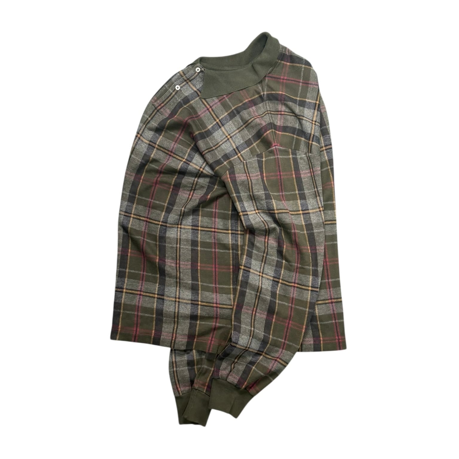 ブリティッシュな空気を感じるタータン調の配色に、ポロシャツという少しスポーティな型を掛け合わせることで、どこか品がありながらも少し違和感のあるバランスに仕上がっています。