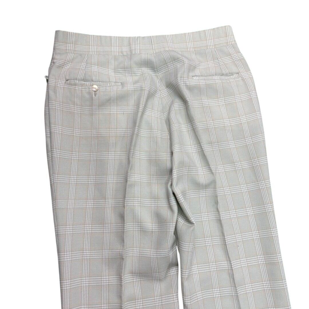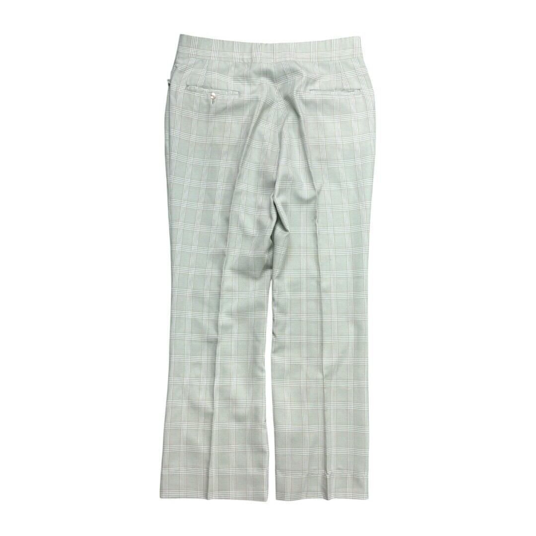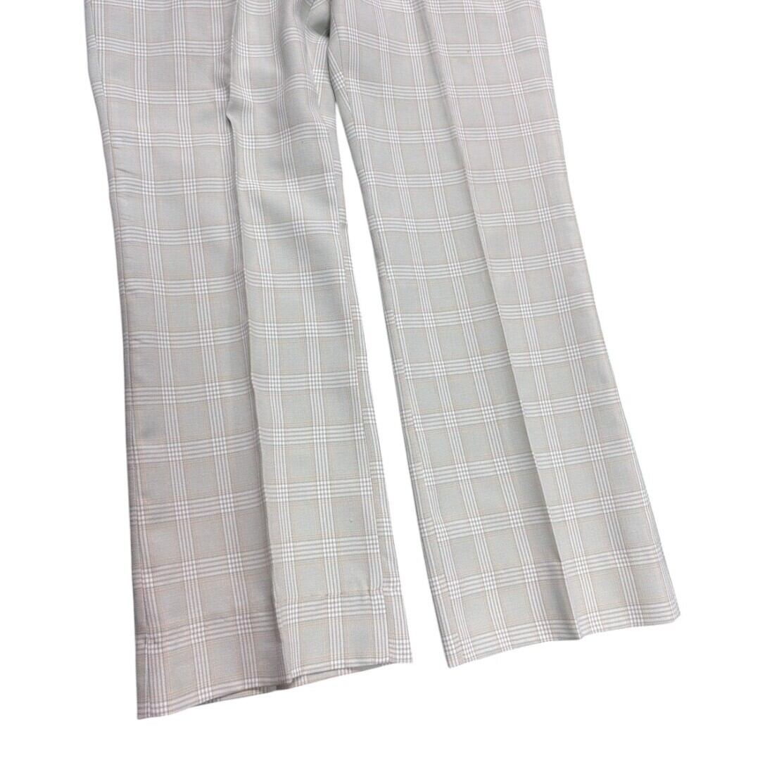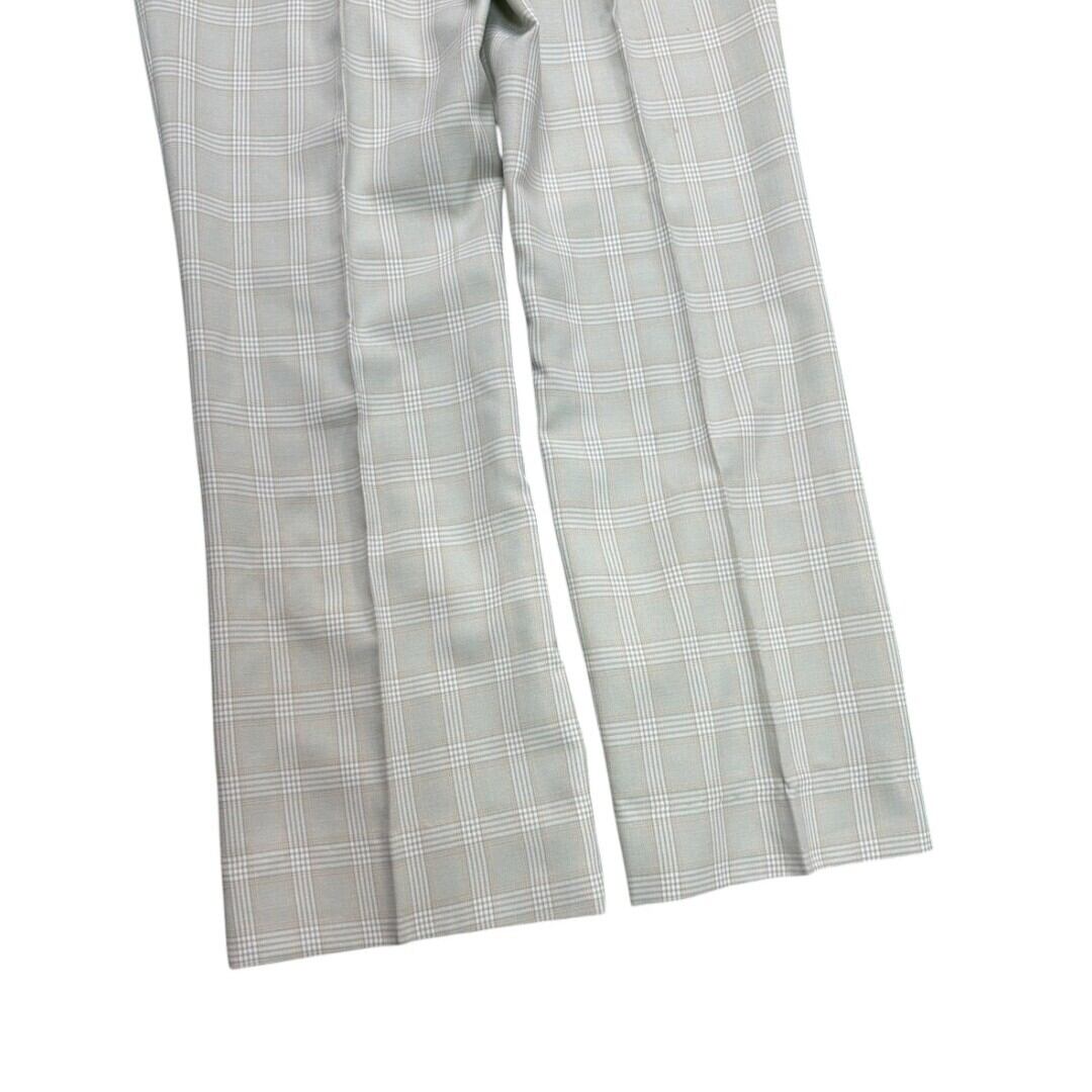 1970年代らしいフレアシルエットが特徴のチェックパンツ。薄いミントカラーを基調にした控えめなチェック柄は、派手すぎずさりげない個性を演出します。生地には程よい張りがあり、フレアの形が美しく保たれるため、履くだけで脚のラインにリズムを作ってくれます。ヴィンテージならではの存在感も魅力です。