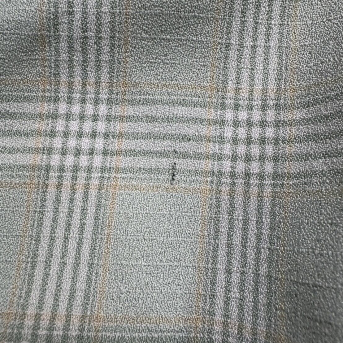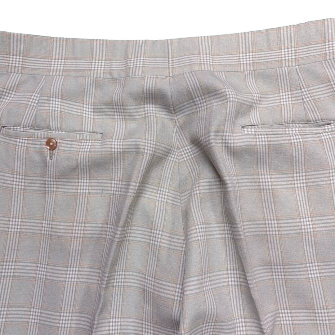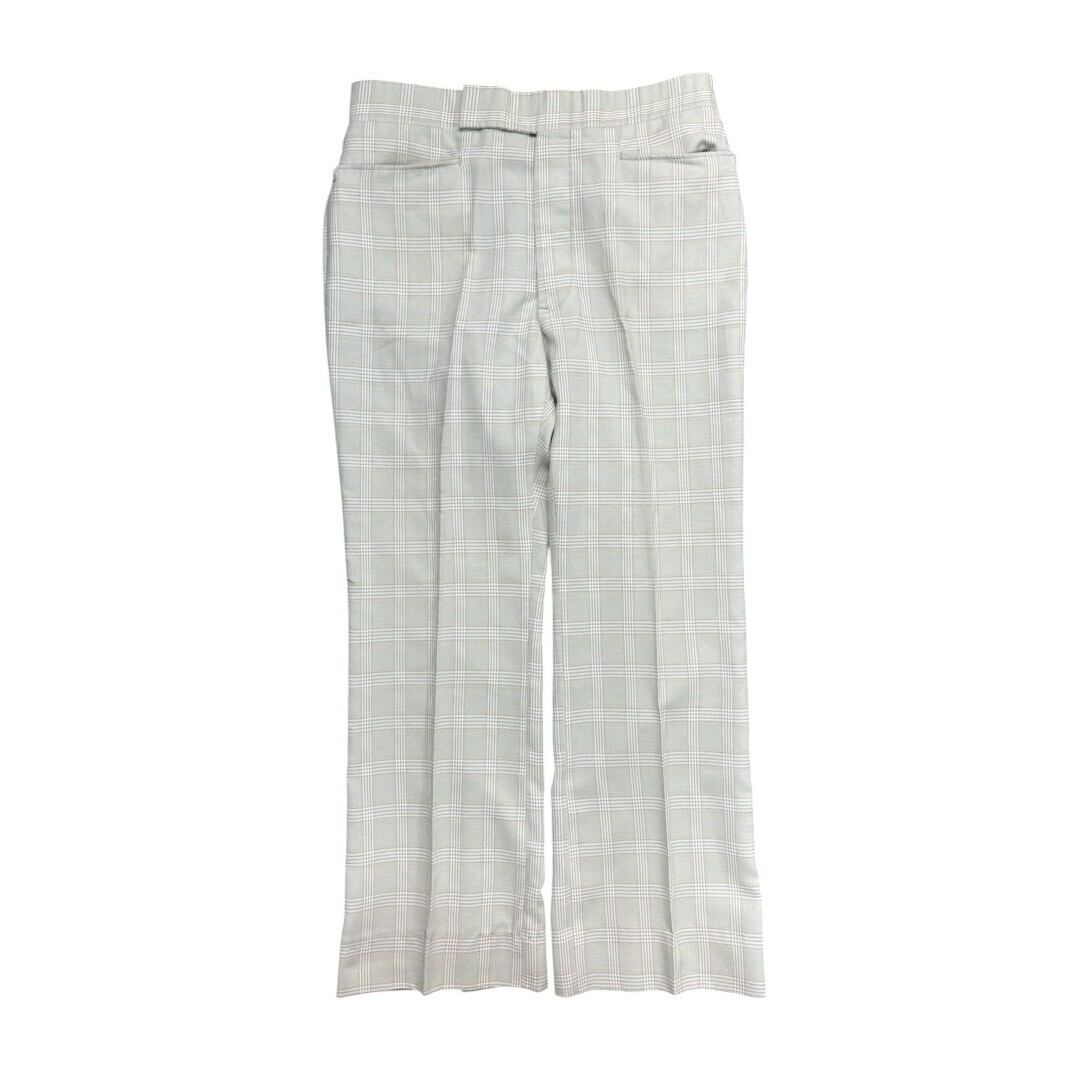 1970年代らしいフレアシルエットが特徴のチェックパンツ。薄いミントカラーを基調にした控えめなチェック柄は、派手すぎずさりげない個性を演出します。生地には程よい張りがあり、フレアの形が美しく保たれるため、履くだけで脚のラインにリズムを作ってくれます。ヴィンテージならではの存在感も魅力です。